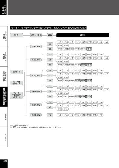 インダクションギアモータG/G3タイプ平行軸H/H2タイプ直交軸F/FAタイプ中空軸・中実軸F2/F3タイプ同心中空軸・同心中実軸技術資料オプションF3タイプギアモータ・ブレーキ付ギアモータMIDシリーズ<同心中空軸/F3S>型式4Pモータ容量枠番減速比三相0.1kW三相0.2kW三相0.4kW(注1)(注1)(注1)三相0.75kW(注1)三相1.5kW三相2.2kW20252025302530353035453545451/51/7.51/101/12.51/151/201/251/301/401/501/601/801/1001/1201/1601/2001/2401/51/51/7.51/7.51/101/101/12.51/12.51/151/151/201/201/251/251/301/301/401/501/601/801/1001/1201/1601/2001/2401/51/51/7.51/7.51/101/101/12.51/12.51/151/151/201/201/251/251/301/301/401/501/601/801/1001/1201/1601/2001/2401/51/51/7.51/7.51/101/101/12.51/151/12.51/151/201/201/251/251/301/301/401/501/601/801/1001/1201/1601/2001/2401/51/51/7.51/7.51/101/101/12.51/12.51/151/151/201/201/251/251/301/301/401/501/601/51/7.51/101/12.51/151/201/251/30ギアモータブレーキ付ギアモータブレーキ手動解放付ギアモータ注1.小枠番タイプになります。注2.はトルク制限機種です。性能表の出力軸許容トルクに特にご注意ください。428