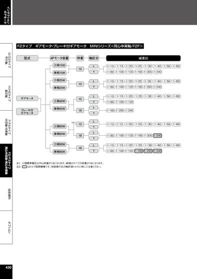 インダクションギアモータG/G3タイプ平行軸H/H2タイプ直交軸F/FAタイプ中空軸・中実軸F2/F3タイプ同心中空軸・同心中実軸技術資料オプションF2タイプギアモータ・ブレーキ付ギアモータMINIシリーズ<同心中実軸/F2F>型式4Pモータ容量枠番軸区分減速比ギアモータブレーキ付ギアモータ三相15W単相15W三相25W単相25W三相40W単相40W三相60W単相60W三相90W単相90W15151518151818(注1)LTLTLTLTLTLTLT1/101/151/201/251/301/401/501/601/801/1001/1201/1601/2001/2401/101/151/201/251/301/401/501/601/801/1001/1201/1601/2001/2401/101/151/201/251/301/401/501/601/801/1001/1201/1601/2001/2401/101/151/201/251/301/401/501/601/801/1001/1201/1601/2001/2401/101/151/201/251/301/401/501/601/801/1001/1201/1601/2001/240注1.三相標準電圧以外は枠番が18になります。単相はすべての枠番が18になります。注2.はトルク制限機種です。性能表の出力軸許容トルクに特にご注意ください。430