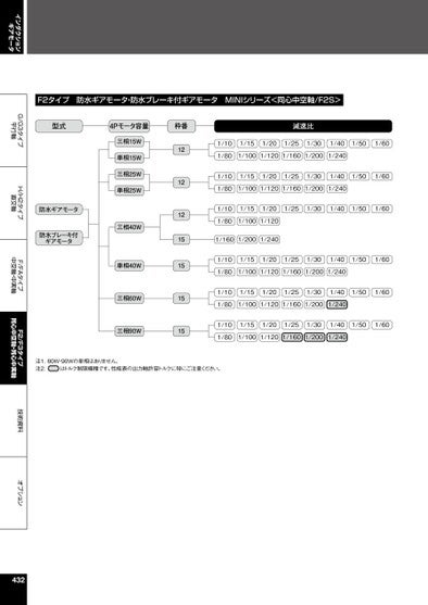 インダクションギアモータG/G3タイプ平行軸H/H2タイプ直交軸F/FAタイプ中空軸・中実軸F2/F3タイプ同心中空軸・同心中実軸技術資料オプションF2タイプ防水ギアモータ・防水ブレーキ付ギアモータMINIシリーズ<同心中空軸/F2S>型式4Pモータ容量枠番減速比防水ギアモータ防水ブレーキ付ギアモータ三相15W単相15W三相25W単相25W三相40W単相40W三相60W三相90W121212151515151/101/801/101/801/151/201/251/301/401/501/601/1001/1201/1601/2001/2401/151/201/251/301/401/501/601/1001/1201/1601/2001/2401/101/151/201/251/301/401/501/601/801/1001/1201/1601/2001/2401/101/801/101/801/101/801/151/201/251/301/401/501/601/1001/1201/1601/2001/2401/151/201/251/301/401/501/601/1001/1201/1601/2001/2401/151/201/251/301/401/501/601/1001/1201/1601/2001/240注1.60W・90Wの単相はありません。注2.はトルク制限機種です。性能表の出力軸許容トルクに特にご注意ください。432