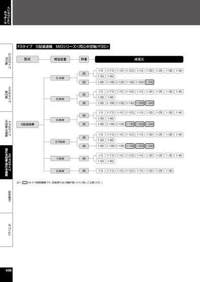 インダクションギアモータG/G3タイプ平行軸H/H2タイプ直交軸F/FAタイプ中空軸・中実軸F2/F3タイプ同心中空軸・同心中実軸技術資料オプションF3タイプS型減速機MIDシリーズ<同心中空軸/F3S>型式相当容量枠番減速比S型減速機0.1kW0.2kW0.4kW0.75kW1.5kW2.2kW202525303035354545451/51/7.51/101/12.51/151/201/251/301/401/501/601/801/1001/1201/1601/2001/2401/51/7.51/101/12.51/151/201/251/301/401/501/601/801/1001/1201/1601/2001/2401/51/7.51/101/12.51/151/201/251/301/401/501/601/801/1001/1201/1601/2001/2401/51/7.51/101/12.51/151/201/251/301/401/501/601/801/1001/1201/1601/2001/2401/51/7.51/101/12.51/151/201/251/301/401/501/601/51/7.51/101/12.51/151/201/251/30注1.はトルク制限機種です。性能表の出力軸許容トルクに特にご注意ください。436