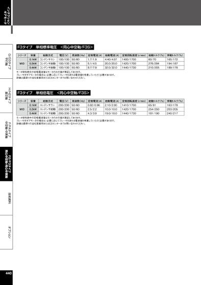 インダクションギアモータG/G3タイプ平行軸H/H2タイプ直交軸F/FAタイプ中空軸・中実軸F2/F3タイプ同心中空軸・同心中実軸技術資料オプション定格回転速度(r/min)始動トルク(%)停動トルク(%)1400/17001420/17001440/173060/70276/294210/205165/172194/187189/178定格回転速度(r/min)始動トルク(%)停動トルク(%)1410/17001420/17001440/173065/81254/250181/190163/178203/205240/217F3タイプ単相標準電圧<同心中空軸/F3S>シリーズMID容量0.1kW0.2kW0.4kW始動方式コンデンサランコンデンサ始動コンデンサ始動電圧(V)100/100100/100100/100周波数(Hz)50/6050/6050/60定格電流(A)1.7/1.95.1/4.58.7/7.9始動電流(A)4.40/4.0720.0/20.032.0/32.0モータ特性表中の定格電流値はモータのみの値が表記してあります。ブレーキ付ギアモータの場合は、必要に応じてブレーキを流れる電流値を考慮していただく必要があります。詳細は最寄りの当社営業所またはCSセンターまでお問い合わせください。F3タイプ単相倍電圧<同心中空軸/F3S>シリーズMID容量0.1kW0.2kW0.4kW始動方式コンデンサランコンデンサ始動コンデンサ始動電圧(V)200/200200/200200/200周波数(Hz)50/6050/6050/60定格電流(A)0.82/0.962.5/2.24.3/3.9始動電流(A)2.10/2.0010.0/10.019.0/18.0モータ特性表中の定格電流値はモータのみの値が表記してあります。ブレーキ付ギアモータの場合は、必要に応じてブレーキを流れる電流値を考慮していただく必要があります。詳細は最寄りの当社営業所またはCSセンターまでお問い合わせください。440