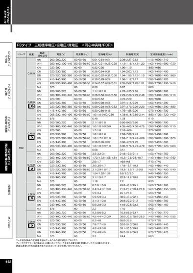 インダクションギアモータG/G3タイプ平行軸H/H2タイプ直交軸F/FAタイプ中空軸・中実軸F2/F3タイプ同心中空軸・同心中実軸技術資料オプションF3タイプ三相標準電圧/倍電圧/異電圧<同心中実軸/F3F>シリーズ容量MID0.1kW0.2kW0.4kW0.75kW1.5kW2.2kW電源・規格記号NNWNKNCNDNENANMANNWNKNCNDNENANMANNWNKNCNDNENANMANNWNKNCNDNENUNMANNWNKNCNENUNMANNWNKNCNENUNMA電圧(V)周波数(Hz)定格電流(A)始動電流(A)定格回転速度(r/min)200/200/220380/400/400/440220/380220/230/380220/220/380/380415/440/480208/230/460/400575200/200/220380/400/400/440220/380220/230/380220/220/380/380415/440/480208/230/460/400575200/200/220380/400/400/440220/380220/230/380220/220/380/380415/440/480208/230/460/400575200/200/220380/400/400/440220/380220/230/380220/220/380/380415/440/480230/460/400575200/200/220380/400/400/440220/380220/230/380415/440/480230/460/400575200/200/220380/400/400/440220/380220/230/380415/440/480230/460/40057550/60/6050/50/60/6060/6050/50/5050/60/50/6050/50/6060/60/60/506050/60/6050/50/60/6060/6050/50/5050/60/50/6050/50/6060/60/60/506050/60/6050/50/60/6060/6050/50/5050/60/50/6050/50/6060/60/60/506050/60/6050/50/60/6060/6050/50/5050/60/50/6050/50/6060/60/506050/60/6050/50/60/6060/6050/50/5050/50/6060/60/506050/60/6050/50/60/6060/6050/50/5050/50/6060/60/50600.61/0.54/0.540.31/0.31/0.28/0.280.52/0.300.55/0.54/0.310.55/0.52/0.31/0.300.30/0.29/0.260.54/0.57/0.29/0.310.201.1/1.0/1.00.56/0.56/0.50/0.500.93/0.520.99/0.98/0.560.99/0.93/0.56/0.520.50/0.50/0.451.0/1.0/0.50/0.560.402.1/1.8/1.81.0/1.0/0.9/0.91.7/1.01.8/1.8/1.01.8/1.7/1.0/1.00.96/0.95/0.821.8/1.8/0.9/1.00.683.5/3.2/3.11.73/1.72/1.58/1.542.9/1.73.0/3.0/1.73.1/2.9/1.8/1.71.54/1.52/1.363.1/1.5/1.71.166.7/6.1/5.93.4/3.4/3.1/3.05.9/3.45.9/5.9/3.43.1/3.1/2.85.9/2.9/3.32.29.3/8.6/8.24.5/4.4/4.2/3.98.3/4.87.9/7.7/4.54.3/4.3/3.87.9/4.0/4.53.32.39/2.27/2.521.12/1.18/1.12/1.221.90/1.101.94/2.03/1.121.94/1.90/1.12/1.101.06/1.12/1.172.35/2.62/1.26/1.210.874.70/4.35/4.852.29/2.38/2.29/2.483.70/2.203.97/4.15/2.293.97/3.70/2.29/2.201.75/1.86/2.004.78/5.16/2.56/2.441.789.50/8.60/9.604.35/4.65/4.30/4.757.10/4.097.63/7.88/4.437.63/7.10/4.43/4.093.96/4.20/4.208.90/9.76/4.73/4.783.5121.8/19.0/21.110.2/10.8/9.8/10.716.9/9.817.8/18.7/10.319.3/16.9/11.2/9.88.6/9.3/9.022.3/11.2/10.87.245.6/40.3/45.121.9/23.2/20.4/22.845.1/25.838.5/40.4/22.120.8/22.2/21.244.9/22.6/23.217.070.3/56.9/63.730.0/32.0/25.0/28.065.0/38.052.0/54.3/30.033.1/35.5/29.865.2/34.8/36.324.41410/1690/17101400/1410/1690/17201680/16801400/1410/14001400/1680/1400/16801390/1420/17201690/1730/1730/141017001400/1680/17001390/1400/1680/17101680/16801400/1410/13901400/1680/1390/16801370/1400/17001680/1720/1720/140017101400/1680/17001390/1400/1680/17101670/16701390/1400/13901390/1670/1390/16701390/1410/16801680/1720/1720/140017001450/1740/17501440/1450/1740/17501740/17401450/1450/14401450/1740/1450/17401440/1450/17501760/1760/145017501450/1740/17601450/1450/1750/17601760/17601450/1450/14501450/1460/17601760/1760/145017601470/1760/17701440/1450/1740/17501770/17701460/1470/14401460/1470/17701770/1770/14701760モータ特性表中の定格電流値はモータのみの値が表記してあります。ブレーキ付ギアモータの場合は、必要に応じてブレーキを流れる電流値を考慮していただく必要があります。詳細は最寄りの当社営業所またはCSセンターまでお問い合わせください。442
