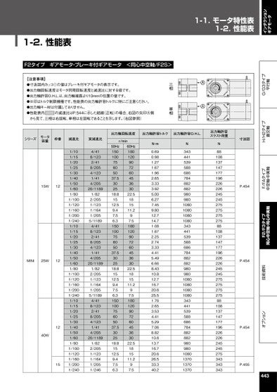 インダクションギアモータオプション技術資料F2/F3タイプ同心中空軸・同心中実軸F/FAタイプ中空軸・中実軸H/H2タイプ直交軸G/G3タイプ平行軸N・m0.690.981.271.671.962.653.333.925.006.277.459.8012.714.71.081.672.252.743.334.415.496.668.4310.812.716.720.625.51.762.653.534.415.297.068.8210.813.716.720.626.533.340.2N343441539588686784882882980980108010801080108034344153958868678488288298098010801080108010803434415395886867848828829809801080137013701370出力軸許容スラスト荷重N881081371471771962262262452452752752752758810813714717719622622624524527527527527588108137147177196226226245245275343343343寸法図P.454P.454P.454P.4554431-1.モータ特性表1-2.性能表AA三相単相●寸法図内カッコ()の値はブレーキ付ギアモータの表示です。●出力軸回転速度はモータ同期回転速度と減速比に対する値です。●出力軸許容O.H.L.は、出力軸端面より10mmの位置の値です。●※印はトルク制限機種です。性能表の出力軸許容トルクに特にご注意ください。●出力軸キー材は付属しておりません。●性能表内の減速比はP.544に示した結線(正転)の場合、右図の矢印Ⓐ側から見て、三相は右回転、単相は左回転であることを示します。右図参照)【注意事項】F2タイプギアモータ・ブレーキ付ギアモータ<同心中空軸/F2S>1-2.性能表出力軸回転速度出力軸許容トルク出力軸許容O.H.L.シリーズモータ容量枠番減速比実減速比r/min1/101/151/201/251/301/401/501/601/801/1001/1201/1601/2001/2401/101/151/201/251/301/401/501/601/801/1001/1201/1601/2001/2401/101/151/201/251/301/401/501/601/801/1001/1201/1601/2001/2404/418/1232/418/2054/1231/414/20520/11891/822/2051/1231/1641/2055/11894/418/1232/418/2054/1231/414/20520/11891/822/2051/1231/1641/2055/11894/418/1232/418/2054/1231/414/20520/11891/822/2051/1231/1641/2051/24650Hz15010075605037.5302518.81512.59.47.56.315010075605037.5302518.81512.59.47.56.315010075605037.5302518.81512.59.47.56.360Hz18012090726045363022.5181511.297.518012090726045363022.5181511.297.518012090726045363022.5181511.297.515W12MINI25W1240W1215
