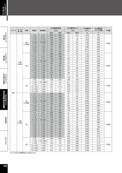 インダクションギアモータG/G3タイプ平行軸H/H2タイプ直交軸F/FAタイプ中空軸・中実軸F2/F3タイプ同心中空軸・同心中実軸技術資料オプションシリーズモータ容量枠番減速比実減速比r/min出力軸回転速度出力軸許容トルクN·m50Hz60Hz11172327334455671117232733445567881111331692112532702702702131415263831041242131415263831041241662082493163954735545545549.2141924273746559.21419242737465574921111401752112702702701825344352708610418253443527086104138173208263328395526554554出力軸許容O.H.L.出力軸許容スラスト荷重寸法図N12301370152016201720186020102110152017601910206021602400255026502840299030903480353035303630363036301520176019102060216024002550265019602250245026002740299031903280348034803480475047504750519051905190N307342380405429466502527375438475506539600637662711747767873883883912912912375438475506539600637662500567613669686747796821870870870117711771177127512751275P.460P.464P.466P.464P.466P.46825(小枠番)三相0.4kW30MID3530(小枠番)三相0.75kW351/51/7.51/101/52/151/101/12.519/2351/151/201/251/301/51/7.51/101/151/201/251/301/52/151/101/12.519/2351/151/201/251/301/401/501/601/801/1001/120※1/160※1/200※1/2401/51/7.51/101/12.51/151/201/251/301/51/7.51/101/12.51/151/201/251/301/401/501/601/801/1001/1201/151/201/251/301/401/501/601/8019/18801/1201/1601/2001/2401/52/151/1019/2351/151/201/251/301/52/151/1019/2351/151/201/251/301/401/501/601/8019/18801/1201/1601/2001/24050Hz30020015012010075605030020015012010075605037.5302518.81512.59.47.56.330020015012010075605030020015012010075605037.5302518.81512.59.47.56.360Hz36024018014412090726036024018014412090726045363022.5181511.397.536024018014412090726036024018014412090726045363022.5181511.397.545※1/160※1/200※1/240注1.P.445の注意事項を必ずお読みください。446