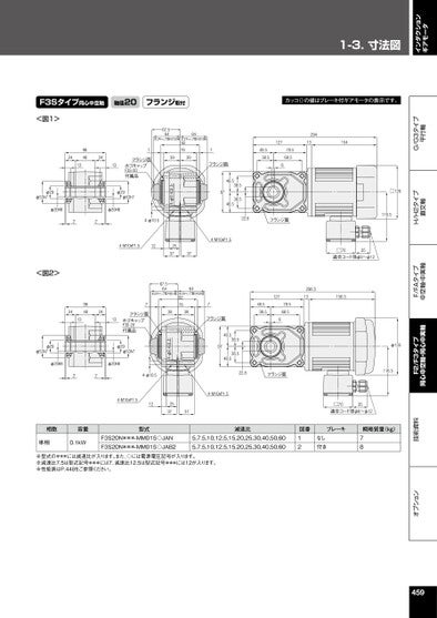 インダクションギアモータ1-3.⼨法図オプション技術資料F2/F3タイプ同心中空軸・同心中実軸F/FAタイプ中空軸・中実軸H/H2タイプ直交軸G/G3タイプ平行軸459F3Sタイプ同心中空軸軸径20フランジ取付カッコ()の値はブレーキ付ギアモータの表示です。□126116.5φ135116.567.564ホゴキャップ取り付け時64ホゴキャップ取り付け時927873939フランジ面2941315448.538.512778.568.569748.538.538.548.54-φ8.4以上<図1>9648241324137フランジ面ホゴキャップF3S-20付属品φ29φ53h7φ29φ53h7φ20H8φ20H8224-φ10.522.8フランジ面4-M10xP1.5122537374-M10xP1.5□7035適合コード径φ8~φ1267.564ホゴキャップ取り付け時64ホゴキャップ取り付け時927839397フランジ面296.513156.548.538.512778.568.569748.538.538.548.54-φ8.4以上<図2>9648242413713フランジ面ホゴキャップF3S-20付属品φ29φ53h7φ29φ53h7φ20H8φ20H8224-φ10.522.8フランジ面4-M10xP1.5122537374-M10xP1.5□7035適合コード径φ8~φ12相数容量単相0.1kW型式減速比F3S20N***-MM01S◇JANF3S20N***-MM01S◇JAB25,7.5,10,12.5,15,20,25,30,40,50,605,7.5,10,12.5,15,20,25,30,40,50,60図番12ブレーキ概略質量(kg)なし付き78※型式の***には減速比が入ります。また、◇には電源電圧記号が入ります。※減速比7.5は型式記号***には7、減速比12.5は型式記号***には12が入ります。※性能表はP.448をご参照ください。