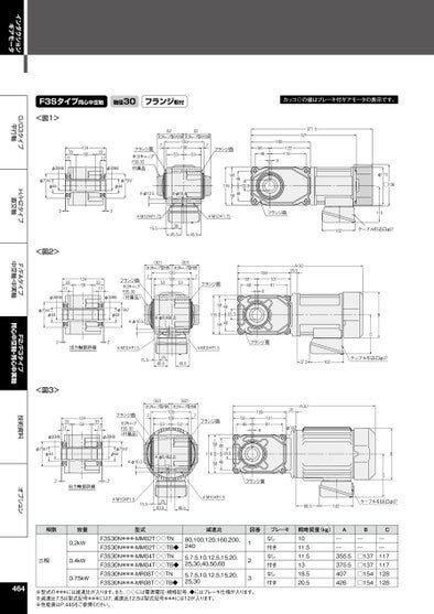 インダクションギアモータG/G3タイプ平行軸H/H2タイプ直交軸F/FAタイプ中空軸・中実軸F2/F3タイプ同心中空軸・同心中実軸技術資料オプションF3Sタイプ同心中空軸軸径30フランジ取付カッコ()の値はブレーキ付ギアモータの表示です。<図1>8282ホゴキャップ取り付け時ホゴキャップ取り付け時1201065353371.5321584618081221101245833173317φ30H8φ30H87フランジ面ホゴキャップF3S-30付属品φ75h7φ44φ75h7φ444-φ12.54-φ10.47フランジ面584611633.34658224-M12×P1.754-M12×1.75フランジ面φ115□12611015.53045.545.5102ケーブル引込口φ27<図2>3317124583317φ30H8φ30H8753フランジ面ホゴキャップF3S-30(付属品)(82)(82)(ホゴキャップ取付時)(ホゴキャップ取付時)120106753フランジ面(A)A20.55848159810191φ75h7φ44φ75h7φ444-φ10.54-φ8.4以上584811633.348582出力軸部詳細24-M10×P1.54-M10×P1.5フランジ面BC15.52540.540.537.5102ケーブル引込口φ27<図3>(82)(82)(ホゴキャップ取付時)(ホゴキャップ取付時)1245833173317φ30H8φ30H8フランジ面7ホゴキャップF3S-30(付属品)12010653537フランジ面φ75h7φ44φ75h7φ444-φ10.54-φ8.4以上584811633.348585848159810191(A)A31φ1422出力軸部詳細2フランジ面BC4-M10×P1.515.52540.540.54-M10×P1.568.5102ケーブル引込口φ27相数容量型式減速比図番ブレーキ0.2kW三相0.4kW0.75kWF3S30N***-MM02T◇◇TNF3S30N***-MM02T◇◇TB◆F3S30N***-MM04T◇◇TNF3S30N***-MM04T◇◇TB◆F3S30N***-MR08T◇◇TNF3S30N***-MR08T◇◇TB◆80,100,120,160,200,2405,7.5,10,12.5,15,20,25,30,40,50,605,7.5,10,12.5,15,20,25,30123なし付きなし付きなし付き概略質量(kg)1011.511.51318.520.5A――355.5375.5407426B――□137□137□154□154C――117117128128※型式の***には減速比が入ります。また、◇◇には電源電圧・規格記号、◆にはブレーキ仕様が入ります。※減速比7.5は型式記号***には7、減速比12.5は型式記号***には12が入ります。※性能表はP.445をご参照ください。464