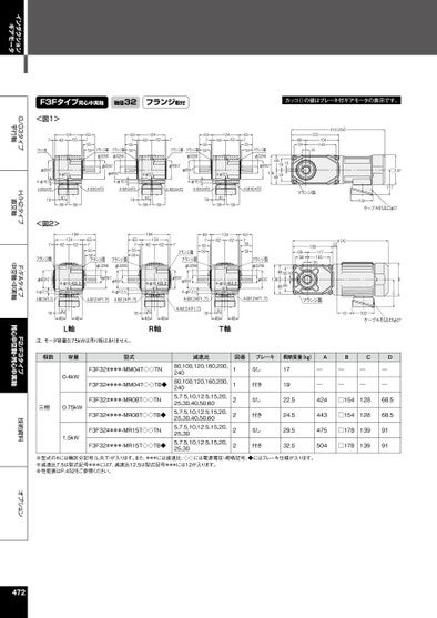 インダクションギアモータG/G3タイプ平行軸H/H2タイプ直交軸F/FAタイプ中空軸・中実軸F2/F3タイプ同心中空軸・同心中実軸技術資料オプションF3Fタイプ同心中実軸軸径32フランジ取付カッコ()の値はブレーキ付ギアモータの表示です。<図1>76212462フランジ面φ85h74-φ16.54-M16×P24-φ13.763755506375550フランジ面φ32h6フランジ面φ32h6φ85h7φ85h74-φ16.512462627フランジ面フランジ面φ32h6φ85h7φ85h74-φ16.54-φ13.71246262637555063755504-φ13.7フランジ面φ32h6φ85h768105413654684-M16×P24-M16×P24-M16×P24-M16×P24-M16×P2414(434)685422215414035フランジ面184058581840585818405858□137117102ケーブル引込口φ27<図2>76212419462フランジ面φ85h74-φ12.54-M12×P1.54-φ10.4以上18304848L軸6375550フランジ面φ32h6フランジ面φ32h66375550φ85h7φ85h74-φ12.54-M12×P1.754-M12×P1.7519462124124626263755506375550627フランジ面フランジ面φ32h64-φ10.4以上φ85h7φ85h74-φ10.4以上4-φ12.54-M12×P1.7518304848R軸4-M12×P1.7518304848T軸185117105356856フランジ面φ32h6φ85h768561013668564-M12×P1.75フランジ面(A)A22BCD102ケーブル引込口φ27注.モータ容量0.75kWは吊り板はありません。相数容量型式減速比図番ブレーキ概略質量(kg)ABCD0.4kW三相0.75kWF3F32#***-MM04T◇◇TNF3F32#***-MM04T◇◇TB◆F3F32#***-MR08T◇◇TNF3F32#***-MR08T◇◇TB◆1.5kWF3F32#***-MR15T◇◇TNF3F32#***-MR15T◇◇TB◆80,100,120,160,200,24080,100,120,160,200,2405,7.5,10,12.5,15,20,25,30,40,50,605,7.5,10,12.5,15,20,25,30,40,50,605,7.5,10,12.5,15,20,25,305,7.5,10,12.5,15,20,25,30112222なし付きなし付きなし付き171922.524.529.532.5――424443475504――――――□15412868.5□15412868.5□178139□1781399191※型式の#には軸区分記号(L,R,T)が入ります。また、***には減速比、◇◇には電源電圧・規格記号、◆にはブレーキ仕様が入ります。※減速比7.5は型式記号***には7、減速比12.5は型式記号***には12が入ります。※性能表はP.452をご参照ください。472