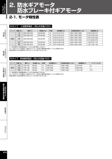 インダクションギアモータG/G3タイプ平行軸H/H2タイプ直交軸F/FAタイプ中空軸・中実軸F2/F3タイプ同心中空軸・同心中実軸技術資料オプション2.防水ギアモータ防水ブレーキ付ギアモータ2-1.モータ特性表F2タイプ三相標準電圧<同心中空軸/F2S>シリーズ容量(W)電圧(V)周波数(Hz)MINI1525406090200/200/220200/200/220200/200/220200/200/220200/200/22050/60/6050/60/6050/60/6050/60/6050/60/60枠番121212151515定格電流(A)定格回転速度(r/min)始動電流(A)0.14/0.13/0.130.21/0.19/0.190.29/0.27/0.270.27/0.26/0.260.40/0.36/0.360.51/0.48/0.481350/1550/16001350/1550/16001350/1550/16001350/1550/15501350/1550/16001350/1550/15500.30/0.28/0.310.44/0.42/0.460.67/0.62/0.680.73/0.69/0.761.04/0.97/1.071.42/1.36/1.49モータ特性表中の定格電流値はモータのみの値が表記してあります。ブレーキ付ギアモータの場合は、必要に応じてブレーキを流れる電流値を考慮していただく必要があります。詳細は最寄りの当社営業所またはCSセンターまでお問い合わせください。F2タイプ単相標準電圧<同心中空軸/F2S>シリーズ容量(W)電圧(V)MINI152540100/100100/100100/100周波数(Hz)50/6050/6050/60枠番121215定格電流(A)0.39/0.350.48/0.480.61/0.66定格回転速度(r/min)1350/16501350/16001350/1650始動電流(A)コンデンサ(μF)0.72/0.670.86/0.801.43/1.365710モータ特性表中の定格電流値はモータのみの値が表記してあります。ブレーキ付ギアモータの場合は、必要に応じてブレーキを流れる電流値を考慮していただく必要があります。詳細は最寄りの当社営業所またはCSセンターまでお問い合わせください。474