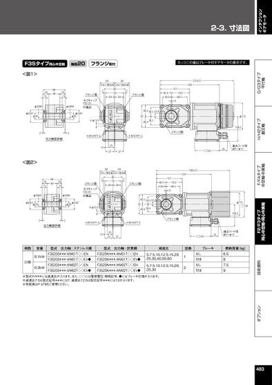 インダクションギアモータ2-3.⼨法図オプション技術資料F2/F3タイプ同心中空軸・同心中実軸F/FAタイプ中空軸・中実軸H/H2タイプ直交軸G/G3タイプ平行軸48312253737適合コード径φ8~φ1235□105F3Sタイプ同心中空軸軸径20フランジ取付カッコ()の値はブレーキ付ギアモータの表示です。φ115108.2964824132413φ20H8φ20H8フランジ面ホゴキャップF3S-20付属品6464ホゴキャップ取り付け時ホゴキャップ取り付け時7927839397フランジ面(316.5)25548.538.512778.568.5648.538.522.89738.548.54-φ8.4以上φ53h7φ294-φ10.5φ53h7φ2922出力軸部詳細4-M10×P1.54-M10×P1.5フランジ面<図1>φ115□126108.26464ホゴキャップ取り付け時ホゴキャップ取り付け時7927839397フランジ面(360.5)27048.538.512778.568.5648.538.522.89738.548.54-φ8.4以上964824132413φ20H8φ20H8φ53h7φ29φ53h7φ29フランジ面ホゴキャップF3S-20付属品4-φ10.522出力軸部詳細4-M10×P1.54-M10×P1.5フランジ面<図2>12253737□10535適合コード径φ8~φ12相数容量型式出力軸:ステンレス鋼三相0.1kW0.2kWF3S20S***-WM01T◇◇ENF3S20S***-WM01T◇◇EV◆F3S20S***-WM02T◇◇ENF3S20S***-WM02T◇◇EV◆型式出力軸:炭素鋼F3S20N***-WM01T◇◇ENF3S20N***-WM01T◇◇EV◆F3S20N***-WM02T◇◇ENF3S20N***-WM02T◇◇EV◆減速比図番ブレーキ概略質量(kg)5,7.5,10,12.5,15,20,25,30,40,50,605,7.5,10,12.5,15,20,25,3012なし付きなし付き6.587.59※型式の***には減速比が入ります。また、◇◇には電源電圧・規格記号、◆にはブレーキ仕様が入ります。※減速比7.5は型式記号***には7、減速比12.5は型式記号***には12が入ります。※性能表はP.478をご参照ください。