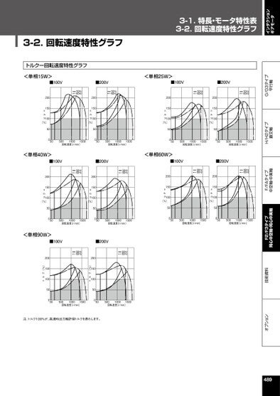 インダクションギアモータ3-1.特長・モータ特性表3-2.回転速度特性グラフオプション技術資料F2/F3タイプ同心中空軸・同心中実軸F/FAタイプ中空軸・中実軸H/H2タイプ直交軸G/G3タイプ平行軸3-2.回転速度特性グラフトルク一回転速度特性グラフ<単相15W><単相25W>■100V■200V■100V■200V50Hz60Hz50Hz60Hz50Hz60Hz50Hz60Hz200150トルク100〔%〕50050200150トルク100〔%〕5005050010001500回転速度〔r/min〕200150トルク100〔%〕50050200150トルク100〔%〕5005050010001500回転速度〔r/min〕50010001500回転速度〔r/min〕50010001500回転速度〔r/min〕<単相40W><単相60W>■100V■200V■100V■200V50Hz60Hz50Hz60Hz50Hz60Hz50Hz60Hz200150トルク100〔%〕50050200150トルク100〔%〕5005050010001500回転速度〔r/min〕200150トルク100〔%〕50050200150トルク100〔%〕5005050010001500回転速度〔r/min〕50010001500回転速度〔r/min〕50010001500回転速度〔r/min〕<単相90W>■100V■200V50Hz60Hz50Hz60Hz200150ク〔%〕ルト1005005050010001500回転速度〔r/min〕50010001500回転速度〔r/min〕200150100ク〔%〕ルト50050注.トルク100%が、高速時出力軸許容トルクを表わします。489