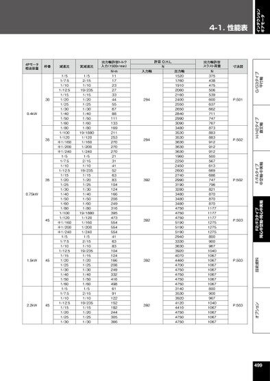 インダクションギアモータ4-1.性能表オプション技術資料F2/F3タイプ同心中空軸・同心中実軸F/FAタイプ中空軸・中実軸H/H2タイプ直交軸G/G3タイプ平行軸4Pモータ相当容量枠番減速比実減速比0.4kW0.75kW303535451.5kW452.2kW451/51/7.51/101/12.51/151/201/251/301/401/501/601/801/1001/120※1/160※1/200※1/2401/51/7.51/101/12.51/151/201/251/301/401/501/601/801/1001/120※1/160※1/200※1/2401/51/7.51/101/12.51/151/201/251/301/401/501/601/51/7.51/101/12.51/151/201/251/301/52/151/1019/2351/151/201/251/301/401/501/601/8019/18801/1201/1601/2001/2401/52/151/1019/2351/151/201/251/301/401/501/601/8019/18801/1201/1601/2001/2401/52/151/1019/2351/151/201/251/301/401/501/601/52/151/1019/2351/151/201/251/30出力軸許容トルク入力(1500r/min)N・m1117232733445567881111331692112532702702702131415263831041241662082493163954735545545544163831041241662082493324164986191122152182244305366許容O.H.L.N入力軸294294392392392392出力軸15201760191020602160240025502650284029903090348035303530363036303630196022502450260027402990319032803480348034804750475047505190519051902940333036303920407044604700475047504750475031403530392041204410475047504750出力軸許容スラスト荷重寸法図N3754384755065396006376627117477678738838839129129125005676136696867477968218708708701177117711771275127512758009009671040106710671067106710671067106780090096710401067106710671067P.501P.502P.502P.503P.503P.503499