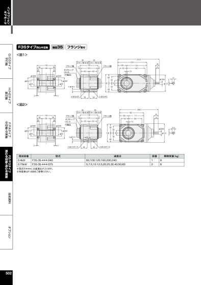 インダクションギアモータG/G3タイプ平行軸H/H2タイプ直交軸F/FAタイプ中空軸・中実軸F2/F3タイプ同心中空軸・同心中実軸技術資料オプションF3Sタイプ同心中空軸軸径35フランジ取付<図1>9595ホゴキャップ取り付け時ホゴキャップ取り付け時1426638203820φ35H8φ35H8フランジ面ホゴキャップF3S-35(付属品)71381246262φ85h7φ49φ85h7φ494-φ16.5フランジ面768541366868545438.3224-M16×P258584-M16×P2316.5222101541403027φ15h6517φ128φ127<図2>1426638203820φ35H8φ35H89595ホゴキャップ取り付け時ホゴキャップ取り付け時7フランジ面ホゴキャップF3S-35付属品1381246262フランジ面7296.56854185117105103532φ85h7φ494-φ12.54-φ10.41366868565638.322.56φ20h6φ1422型式4-M12×P1.7548484-M12×P1.75減速比80,100,120,160,200,2405,7.5,10,12.5,20,25,30,40,50,60概略質量(kg)図番1299φ85h7φ492相当容量0.4kW0.75kWF3S-35-***-040F3S-35-***-075※型式の***には減速比が入ります。※性能表はP.499をご参照ください。502