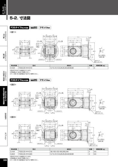 インダクションギアモータG/G3タイプ平行軸H/H2タイプ直交軸F/FAタイプ中空軸・中実軸F2/F3タイプ同心中空軸・同心中実軸技術資料オプション6464ホゴキャップ取り付け時ホゴキャップ取り付け時7927873939フランジ面194.512778.568.5648.538.5S84.5964824132413フランジ面ホゴキャップF3S-20付属品φ20H848.538.59722.838.548.54-φ8.4以上φ53h7φ294-φ10.5<図1>φ20H8φ53h7φ29224-M10×P1.54-M10×P1.53737相当容量0.1kW型式減速比F3SS-20-***-0105,7.5,10,12.5,20,25,30,40,50,60※型式の***には減速比が入ります。※性能表はP.504をご参照ください。※モータ取り付け部詳細はP.627をご参照ください。F3Sタイプ同心中空軸軸径25フランジ取付5-2.⼨法図F3Sタイプ同心中空軸軸径20フランジ取付7979ホゴキャップ取り付け時ホゴキャップ取り付け時711410050507フランジ面53.543.5225.5105.595.51598S84.553.543.510728.343.553.54-φ8.4以上7979ホゴキャップ取り付け時ホゴキャップ取り付け時711410050507フランジ面207140886.576.553.543.5S84.553.543.510728.343.553.5<図2>φ25H8φ66h7φ391186427142714フランジ面ホゴキャップF3S-25付属品φ25H8φ66h7φ394-φ10.5<図3>φ25H8φ66h7φ391186427142714フランジ面ホゴキャップF3S-25φ25H8(付属品)φ66h7φ394-φ10.5φ110G7φ160φ130510φ11H7深さ33(基準□面)S4-M8×P1.25深さ11(カンツウ)図番14概略質量(kg)φ110G7φ160φ130510φ11H7深さ33(基準□面)S4-M8×P1.25深さ11(カンツウ)φ110G7φ160φ130510φ11H7深さ33(基準□面)S4-M8×P1.25深さ11(カンツウ)概略質量(kg)図番235.55.5224-M10×P1.539.539.54-M10×P1.5224-M10×P1.54-M10×P1.539.539.5相当容量0.1kW0.2kWF3SS-25-***-010F3SS-25-***-020型式※型式の***には減速比が入ります。※性能表はP.504をご参照ください。※モータ取り付け部詳細はP.627をご参照ください。506減速比80,100,120,160,200,2405,7.5,10,12.5,20,25,30,40,50,60