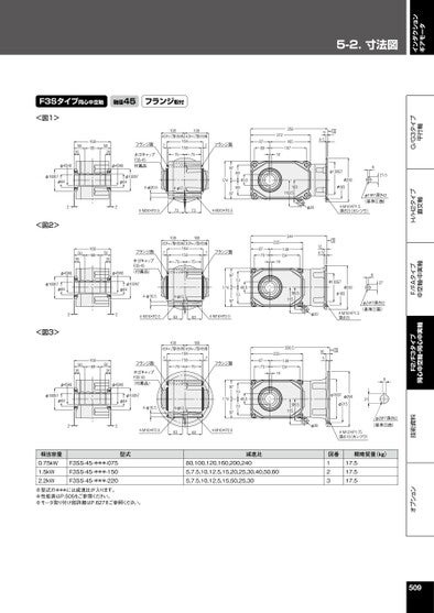 インダクションギアモータ5-2.寸法図オプション技術資料F2/F3タイプ同心中空軸・同心中実軸F/FAタイプ中空軸・中実軸H/H2タイプ直交軸G/G3タイプ平行軸F3Sタイプ同心中空軸軸径45フランジ取付<図1>108108ホゴキャップ取り付け時ホゴキャップ取り付け時5026168685026φ45H8φ45H8フランジ面7ホゴキャップF3S-45付属品1641507575フランジ面78769φ100h7φ64φ100h7φ644-φ20.54-φ17.2224-M20×P2.573734-M20×P2.5<図2>108108ホゴキャップ取り付け時ホゴキャップ取り付け時1686850265026φ45H8φ45H8フランジ面7ホゴキャップF3S-45(付属品)1641507575フランジ面7φ100h7φ64φ100h7φ644-φ16.54-φ13.7224-M16×P2.063634-M16×P2.0<図3>35018516727214S94.5621.5φ130G7φ200φ165φ19F7深さ42(基準□面)S4-M10×P1.5深さ23(カンツウ)103119.5φ20344235148134148773S124.5φ130G7φ200φ16598.5115φ204-M10×P1.5深さ25827φ24F7深さ52(基準□面)S1748787696948.81748787737348.81748787737348.8108108ホゴキャップ取り付け時ホゴキャップ取り付け時716415075757フランジ面356.5235148134148773S1651686850265026φ45H8φ45H8フランジ面ホゴキャップF3S-45(付属品)φ100h7φ64φ100h7φ644-φ16.54-φ13.7224-M16×P2.063634-M16×P2.0相当容量0.75kW1.5kW2.2kWF3SS-45-***-075F3SS-45-***-150F3SS-45-***-220型式※型式の***には減速比が入ります。※性能表はP.505をご参照ください。※モータ取り付け部詳細はP.627をご参照ください。減速比80,100,120,160,200,2405,7.5,10,12.5,15,20,25,30,40,50,605,7.5,10,12.5,15,50,25,3098.5115φ208φ180G7φ250φ21531φ28F7深さ62(基準□面)S4-M12×P1.75深さ(カンツウ)16図番123概略質量(kg)17.517.517.5509
