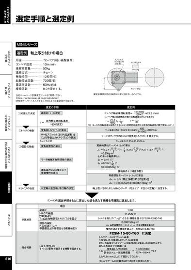 インダクションギアモータG/G3タイプ平行軸H/H2タイプ直交軸F/FAタイプ中空軸・中実軸F2/F3タイプ同心中空軸・同心中実軸技術資料オプションコンベア軸必要回転速度=コンベア軸と減速機出力軸の回転速度は同じであるから≒21.2r/min10×1000150×π018i=51721.21600≒i=(注.モータの回転速度は負荷の大きさにより同期回転速度から定格回転速度の間で変動します。)TL=9.8×(50+3×2+5)×0.2×=9.0N・m1502×1000サービスファクタ(Sf)により実負荷トルク(TL)を補正する。TLE=9.0×1.25≒11.25N・mスプロケットPCDφ1503kg/個V=10m/minM=50kgr選定手順例以外の条件は計算に含まないものとする。チェーン5kg選定例0.1520.15212JL={50×()2}+{×3×()2×2}+{5×()2}実負荷慣性モーメント(JL)の算出018JLのモータ軸換算(Jℓ)Jℓ=JL×(i)2Jℓ=0.33×()2≒0.000052kg・m20.152=0.33kg・m2運転条件より補正係数3等価慣性モーメントJJℓE)の算出JℓE=Jℓ×(補正係数)P.523[表-3]JℓE=0.000052×3=0.000156kg・m2選定手順と選定例MINIシリーズ選定例軸上取り付けの場合用途…………………コンベア(軽い衝撃負荷)コンベア速度………10m/min運搬物質量…………50kg連結方式……………チェーン稼働時間……………12時間/日起動停止回数………720回/日電源周波数…………60Hz地域摩擦係数……………0.2と仮定する。当社ホームページ計算選定ツールをご利用ください。(https://sentei.nissei-gtr.co.jp/calculation)使用条件・シリーズを入力すると、WEB上で容量計算が可能です。選定の手順①減速比の決定減速比(i)の決定i=出力軸必要回転速度1600(仮定)②トルクの検討実負荷トルク(TL)の算出サービスファクタ(Sf)P.522[表-1]による等価出力トルク(TLE)の算出TLE=TL×Sf③慣性の検討実負荷慣性の算出モータ軸換算負荷慣性の算出運転条件による補正にて等価慣性の算出④タイプの決定中空軸か直交軸、平行軸の決定軸上取り付けにより、MINIシリーズF2タイプF2S(中空軸)に決定する。①~④の選定手順をもとに算出した値を満たす機種を項目別に選定します。計算結果項目減速比トルクの検証性能表よりTLE≦出力軸許容トルク(TA)を選ぶ慣性の検証P.523表-1]より等価慣性≦許容慣性なる機種を選ぶ総合判断トルク・慣性よりすべての条件を満足する機種を選定する。1/8011.25N・mトルクを満たす(TLE≦TAとなる)機種を選ぶとF2SM-12-80-T400.000156kg・m2JℓE≦許容慣性モーメントJJA)となる機種を選ぶと慣性を満たす機種を選ぶとF2SM-15-80-T60F2SM-15-80-T60に決定トルクアームはオプション品番TAF2S-15を推奨します。P.1242参照また、お客様でトルクアームを製作される場合、出力軸中心から回り止め部までの距離rは実負荷トルク×1000=11.25×10001274-9.8×4=9.1r≧許容O.H.L.-減速機質量516となり、9.1mm以上にて設計してください。※トルクアームの計算式はP.1239をご参照ください。