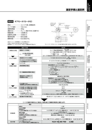 インダクションギアモータオプション技術資料F2/F3タイプ同心中空軸・同心中実軸F/FAタイプ中空軸・中実軸H/H2タイプ直交軸G/G3タイプ平行軸コンベア軸必要回転速度=≒21.2r/minコンベア軸と減速機出力軸のスプロケット径が同じであるから10×1000150×π018i=51721.21600≒i=(注:モータの回転速度は負荷の大きさにより同期回転速度から定格回転速度の間で変動します。)TL=9.8×(40+3×2+5)×0.2×1502×1000=7.5N・mサービスファクタ(Sf)により実負荷トルク(TL)を補正する。TLE=7.5×1.25≒9.4N・m実負荷慣性モーメント(JL)の算出JL={40×()2}+{×3×()2×2}+{5×()2}0.150.150.151222018JLのモータ軸換算(Jℓ)Jℓ=JL×(i)2Jℓ=0.27×()2≒0.000042kg・m22=0.27kg・m2LRTHLM-18-80-T60K1=1K2=1運転条件より補正係数3等価慣性モーメントJJℓE)の算出JℓE=Jℓ×(補正係数)P.523[表-3]JℓE=0.000042×3=0.000126kg・m2JℓE≦許容慣性モーメントJJA)となる機種を選ぶとO.H.L.==376N9.4×1×1502×1000※ベルトの張力など、他にもO.H.L.に影響する要素がある場合は、お客様にて数値の追加を行ってください。チェーン(1)、スプロケット(1)、その他の条件は計算に含まないものとする。選定例当社ホームページ計算選定ツールをご利用ください。(https://sentei.nissei-gtr.co.jp/calculation)使用条件・シリーズを入力すると、WEB上で容量計算が可能です。選定の手順①減速比の決定減速比(i)の決定i=出力軸必要回転速度1600仮定)②トルクの検討実負荷トルク(TL)の算出サービスファクタ(Sf)P.522[表-1]による等価出力トルク(TLE)の算出TLE=TL×Sf③慣性の検討実負荷慣性の算出モータ軸換算負荷慣性の算出運転条件による補正にて等価慣性の算出P.523[表-1]より等価慣性≦許容慣性なる機種を選ぶ④O.H.L.の検討P.525[表-1]より連結方法K1の決定P.525[表-2]より荷重位置K2の決定O.H.L.=TLE×K1×K2R※R:減速機軸に取り付けられるスプロケットなどのピッチ円半径選定例ギアモータ(モータ付)用途…………………コンベア(軽い衝撃負荷)コンベア速度………10m/min運搬物質量…………40kg連結方式……………チェーン(軸の中央に位置する)稼働時間……………12時間/日起動停止回数………720回/日電源周波数…………60Hz地域摩擦係数……………0.2と仮定する。スプロケット(2)PCDφ1503kg/個スプロケット(1)φ50V=10m/minM=40kgチェーン(1)φ50チェーン(2)5kg517376NLRTO.H.L.を満たす(O.H.L.≦許容O.H.L.となる)機種を選ぶとHLM-18-80-T60HLM-18-80-T60に決定LRTLRTJℓE≦許容慣性モーメントJJA)となる機種を選ぶと慣性を満たす機種を選ぶとHLM-18-80-T600.000126kg・m2LRTトルクを満たす(TLE≦TAとなる)機種を選ぶとHLM-15-80-T401/809.4N・m項目減速比トルクの検証性能表よりTLE≦出力軸許容トルク(TA)を選ぶ慣性の検証P.523表-1]より等価慣性≦許容慣性なる機種を選ぶO.H.L.の検証性能表よりO.H.L.≦許容O.H.L.を選ぶトルク・慣性・O.H.L.よりすべての条件を満足する機種を選定する。計算結果総合判断⑤タイプの決定直交軸か平行軸の決定取り付けスペースより、MINIシリーズHタイプ(直交軸)に決定する。①~⑤の選定手順をもとに算出した値を満たす機種を項目別に選定します。