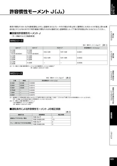 インダクションギアモータオプション技術資料F2/F3タイプ同心中空軸・同心中実軸F/FAタイプ中空軸・中実軸H/H2タイプ直交軸G/G3タイプ平行軸許容慣性モーメントJ(JA)負荷の慣性が大きいものを断続運転しますと、起動時(またはブレーキ付の場合の停止時)に瞬間的に大きなトルクが発生し思わぬ事故を起こすことがありますので相手機械の慣性の大きさは連結方式、起動頻度によって下表の許容値以内になるようにしてください。■容量別許容慣性モーメントJ(モータ軸または入力軸換算値)MINIシリーズGタイプHタイプG-12枠G-22枠(15・25・40・60W)H-15枠H-22枠(15・25・40・60W)F2タイプF2S-12枠F2F-15枠G-15枠G-28枠G-32枠G-18枠G-40枠H-18枠H-28枠H-32枠H-40枠F2S-15枠F2F-18枠--0.00010.00020.0006単位:慣性モーメントJkg・m2)[表-1]許容慣性モーメントJJA)注1.モータ軸(入力軸)換算慣性モーメントJ=出力軸慣性モーメントJ×(減速比)2(例:減速比1/20ならば1/400)MIDシリーズ三相単相許容慣性モーメントJJA)単位:慣性モーメントJkg・m2)[表-2]0.1kW0.2kW0.4kW0.75kW1.5kW2.2kW0.1kW0.2kW0.4kW---0.00080.00100.00150.00300.00500.0070注1.減速機で入力回転速度1800r/min以上でご使用の場合は上記の値に(1800/入力r/min)2を乗じたものが許容慣性モーメントJになります。(例:入力軸r/minが3600の場合、許容慣性モーメントは1/4となります。)注2.モータ軸(入力軸)換算慣性モーメントJ=出力軸慣性モーメントJ×(減速比)2(例:減速比1/20ならば1/400)■運転条件による許容慣性モーメントJの補正係数連結方法直結などでガタがない場合チェーン掛けなどでガタがある場合起動頻度70回/日以下70回/日を超える時70回/日以下70回/日を超える時11.523[表-3]補正係数523