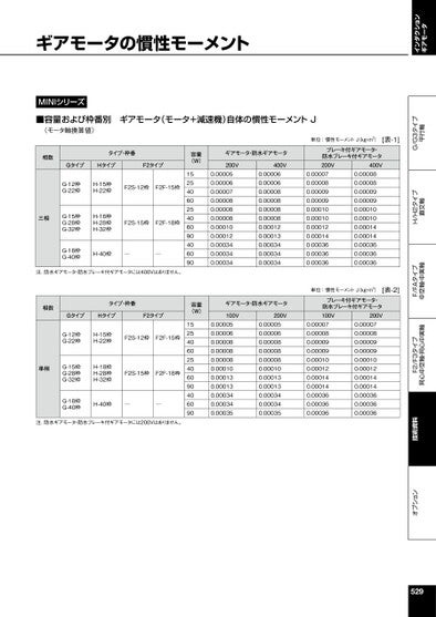 インダクションギアモータオプション技術資料F2/F3タイプ同心中空軸・同心中実軸F/FAタイプ中空軸・中実軸H/H2タイプ直交軸G/G3タイプ平行軸ギアモータの慣性モーメントMINIシリーズ■容量および枠番別ギアモータ(モータ+減速機)自体の慣性モーメントJ〈モータ軸換算値〉相数タイプ・枠番GタイプHタイプF2タイプ容量(W)ギアモータ・防水ギアモータ200V400V単位:慣性モーメントJkg・m2)[表-1]ブレーキ付ギアモータ・防水ブレーキ付ギアモータ200V400VG-12枠G-22枠H-15枠H-22枠F2S-12枠F2F-15枠三相G-15枠G-28枠G-32枠G-18枠G-40枠H-18枠H-28枠H-32枠F2S-15枠F2F-18枠H-40枠──注.防水ギアモータ・防水ブレーキ付ギアモータには400Vはありません。15254060254060904060900.000050.000060.000070.000080.000080.000080.000100.000120.000340.000340.000340.000060.000060.000080.000080.000080.000080.000120.000130.000340.000340.000340.000070.000080.000090.000090.000100.000100.000120.000140.000360.000360.000360.000080.000080.000090.000090.000100.000100.000140.000140.000360.000360.00036相数タイプ・枠番GタイプHタイプF2タイプ容量(W)ギアモータ・防水ギアモータ100V200V単位:慣性モーメントJkg・m2)[表-2]ブレーキ付ギアモータ・防水ブレーキ付ギアモータ100V200VG-12枠G-22枠H-15枠H-22枠F2S-12枠F2F-15枠単相G-15枠G-28枠G-32枠G-18枠G-40枠H-18枠H-28枠H-32枠F2S-15枠F2F-18枠H-40枠──注.防水ギアモータ・防水ブレーキ付ギアモータには200Vはありません。15254060254060904060900.000050.000060.000080.000080.000080.000100.000130.000130.000340.000340.000350.000050.000060.000080.000080.000080.000100.000130.000130.000340.000340.000350.000070.000080.000090.000090.000100.000120.000140.000140.000360.000360.000360.000070.000080.000090.000090.000100.000120.000140.000140.000360.000360.00036529