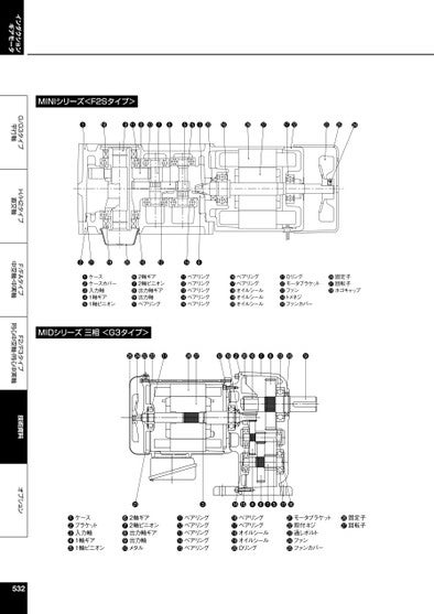 インダクションギアモータG/G3タイプ平行軸H/H2タイプ直交軸F/FAタイプ中空軸・中実軸F2/F3タイプ同心中空軸・同心中実軸技術資料オプションMINIシリーズ<F2Sタイプ>118911813765153201626271722232524262728固定子回転子ホゴキャップ1617181920ベアリングベアリングオイルシールオイルシールオイルシール2122232425Oリングモ-タブラケットファントメネジファンカバー1112131415ベアリングベアリングベアリングベアリングベアリング2軸ギア2軸ピニオン出力軸ギア出力軸ベアリング678910ケ-スケ-スカバ-入力軸1軸ギア1軸ピニオン1234522119281012144MIDシリーズ三相<G3タイプ>❷❶❽❾❸❹❻❼❺1112131415ベアリングベアリングベアリングベアリングベアリング1617181920ベアリングベアリングオイルシールオイルシールOリング2122232425モ-タブラケット取付ネジ通しボルトファンファンカバ-2627固定子回転子2軸ギア2軸ピニオン出力軸ギア出力軸メタル678910ケ-スブラケット入力軸1軸ギア1軸ピニオン12345532