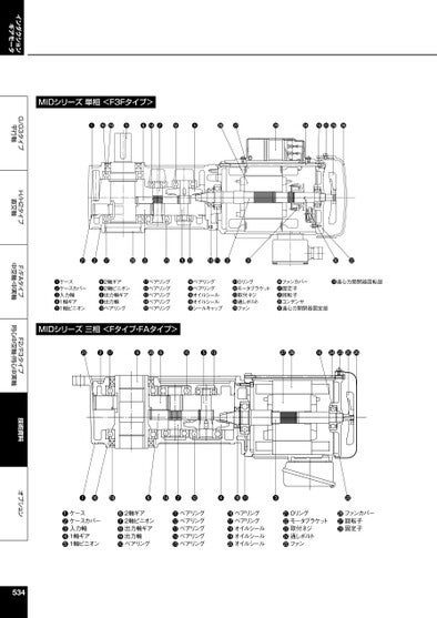 インダクションギアモータG/G3タイプ平行軸H/H2タイプ直交軸F/FAタイプ中空軸・中実軸F2/F3タイプ同心中空軸・同心中実軸技術資料オプションMIDシリーズ単相<F3Fタイプ>❶❾❻❼❹❷❽❺❸❶ケース❷ケースカバー❸入力軸❹1軸ギア❺1軸ピニオン❻2軸ギア❼2軸ピニオン❽出力軸ギア❾出力軸ベアリングベアリングベアリングベアリングベアリングベアリングベアリングベアリングオイルシールオイルシールシールキャップOリングモータブラケット取付ネジ通しボルトファンファンカバー固定子回転子コンデンサ遠心力開閉器固定部遠心力開閉器回転部MIDシリーズ三相<Fタイプ・FAタイプ>❷❾❽❺262728ファンカバ-回転子固定子1617181920ベアリングベアリングオイルシールオイルシールオイルシール2122232425Oリングモ-タブラケット取付ネジ通しボルトファン1112131415ベアリングベアリングベアリングベアリングベアリング2軸ギア2軸ピニオン出力軸ギア出力軸ベアリング678910ケ-スケ-スカバ-入力軸1軸ギア1軸ピニオン12345❶❻❼❹❸534