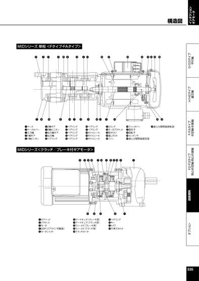 インダクションギアモータオプション技術資料F2/F3タイプ同心中空軸・同心中実軸F/FAタイプ中空軸・中実軸H/H2タイプ直交軸G/G3タイプ平行軸MIDシリーズ単相<Fタイプ・FAタイプ>❷❾❽❺❶❻❼❹❸❶ケース❷ケースカバー❸入力軸❹1軸ギア❺1軸ピニオン❻2軸ギア❼2軸ピニオン❽出力軸ギア❾出力軸ベアリングベアリングベアリングベアリングベアリングベアリングベアリングベアリングオイルシールオイルシールオイルシールOリングモータブラケット取付ネジ通しボルトファンファンカバー固定子回転子コンデンサ遠心力開閉器固定部遠心力開閉器回転部MIDシリーズ<クラッチ/ブレーキ付ギアモータ>❸❾❺❼❷❻❽❹❶❶ギアヘッド❷ブラケット❸モータ❹OSP(スプライン可動型)❺モータシャフト❻アーマチュア(ブレーキ用)❼アーマチュア(クラッチ用)❽フィールド(ブレーキ用)❾フィールド(クラッチ用)クラッチロータベアリングキートメワ穴角穴ボルト535