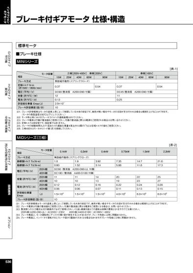 インダクションギアモータG/G3タイプ平行軸H/H2タイプ直交軸F/FAタイプ中空軸・中実軸F2/F3タイプ同心中空軸・同心中実軸技術資料オプションブレーキ付ギアモータ仕様・構造標準モータ■ブレーキ仕様MINIシリーズ項目モータ容量ブレーキ方式定格トルクN・m〈於1500〜1800r/min〉電圧〈平均〉V)容量〈於75℃〉W)電流〈於75℃〉A)許容総仕事量Emax(J)ブレーキ許容頻度(回/分)三相[200V・400V]単相[200V]25W40W15W60W無励磁作動形(スプリングクローズ)90W単相[100V]15W25W40W60W90W[表-1]0.370.540.370.54DC90(整流器A200-D90付属)120.132.9×10710DC45(整流器A200-D90付属)110.25注1.ブレーキ許容頻度はモータの温度上昇によって制限している大体の目安です。負荷が軽い場合やモータの冷却が充分行われる場合は頻度を上げることができます。(モータの表面温度は90℃以下にしてください。)注2.モータ停止時におけるブレーキコイルへの連続通電はさけてください。注3.ブレーキ電源は付属の整流器をご使用ください。付属の整流器と異なる電源をご使用される場合はお問い合わせください。注4.定格トルクは目安値です。保証値ではありません。注5.ブレーキの制動時間および1回あたりの連結仕事量を算出される際の「Td」は定格トルクの値をご使用ください。注6.三相400Vはモータからリード線(赤)を接続してください。MIDシリーズ(三相)項目モータ容量ブレーキ方式静摩擦トルクTsN・m)動摩擦トルクTd(N・m)電圧(平均)V)容量(於75℃)(W)電流(於75℃)(A)200V級400V級200V級400V級200V級400V級許容総仕事量Emaxブレーキ許容頻度(回/分)(J)0.1kW0.2kW0.4kW0.75kW1.5kW2.2kW[表-2]1.91.52無励磁作動形(スプリングクローズ)1.00.80DC90(整流器A200-D90-UL付属)DC180(整流器A400-D180付属)11100.120.0611100.120.063.923.1414130.160.077.355.8820190.220.1114.711.822230.240.1321.617.325270.280.151.5×1081.5×1081.5×1084.0×1086.0×1086.0×10810注1.ブレーキ許容頻度はモータの温度上昇によって制限している大体の目安です。負荷が軽い場合やモータの冷却が充分行われる場合は頻度を上げることができます。注2.ブレーキ電源は付属の整流器をご使用ください。付属の整流器と異なる電源をご使用になる場合は、お問い合わせください。注3.整流器への入力電圧は次の範囲内で必ずご使用ください。くり返し範囲を超えての運転は故障の要因となりますのでご注意ください。200V級(A200-D90-UL):AC200V~230V400V級(A400-D180):AC380V~480V注4.ブレーキ構造上、モータ運転時にディスクの擦り音が発生することがありますが、ブレーキ性能には特に問題ありません。注5.ブレーキ構造上、インバータで運転するとブレーキ部から騒音が大きくなる場合もありますがブレーキ性能には特に問題ありません。536