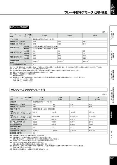 インダクションギアモータオプション技術資料F2/F3タイプ同心中空軸・同心中実軸F/FAタイプ中空軸・中実軸H/H2タイプ直交軸G/G3タイプ平行軸MIDシリーズ(単相)項目モータ容量0.1kW0.2kW0.4kWブレーキ方式静摩擦トルクTsN・m)動摩擦トルクTd(N・m)電圧(平均)V)容量(於75℃)(W)電流(於75℃)(A)100V級200V級100V級200V級100V級200V級無励磁作動形(スプリングクローズ)0.980.78DC90(整流器A100-D90-UL付属)DC90(整流器A200-D90-UL付属)15150.170.171.961.5715150.170.173.923.1426260.290.29許容総仕事量Emaxブレーキ許容頻度(回/分)(J)1.5×10861.5×1084.0×108注1.ブレーキ許容頻度はモータの温度上昇によって制限している大体の目安です。負荷が軽い場合やモータの冷却が充分行われる場合は頻度を上げることができます。注2.モータ停止時におけるブレーキコイルへの連続通電はさけてください。注3.ブレーキ電源は付属の整流器をご使用ください。付属の整流器と異なる電源をご使用になる場合は、お問い合わせください。注4.単相モータの遠心力スイッチの接点寿命は約30万回を目安としています。注5.静摩擦トルク・動摩擦トルクは目安値です。保証値ではありません。注6.整流器への入力電圧は次の範囲内で必ずご使用ください。くり返し範囲を超えての運転は故障の原因となりますのでご注意ください。A100-D90-UL:AC100V~120VA200-D90-UL:AC200V~230VMIDシリーズクラッチ/ブレーキ付項目モータ容量三相0.1kW三相0.2kW三相0.4kW三相0.75kW作動方式静摩擦トルクTs(N・m)動摩擦トルクTd(N・m)電圧(平均)V)容量励磁作動形(マグネットクローズ)1.961.57DC90(整流器A200-D90付属)1.961.57(於75℃クラッチ/ブレーキ)W)10/12電流(於75℃クラッチ/ブレーキ)A)アーマチュア吸引時間tas)トルク立上がり時間(s)トルク消滅時間(s)許容連結仕事量(1回当り)J)許容総仕事量Emax(J)許容頻度(回/分)0.11/0.140.0100.0200.015151.2×1085010/120.11/0.140.0100.0200.015151.2×1083.923.1414/160.15/0.180.0150.0500.020272.2×1087.355.8813/190.14/0.210.0200.0700.040494.3×108注1.許容頻度は大体の目安で、使用条件などにより変わります。注2.許容頻度はモータの温度上昇によって制限している大体の目安です。負荷が軽い場合やモータの冷却が充分行われる場合は頻度を上げることができます。注3.モータ停止時におけるクラッチ/ブレーキコイルへの連続通電はさけてください。注4.クラッチ/ブレーキ電源は付属の整流器をご使用ください。付属の整流器と異なる電源をご使用になる場合は、お問い合わせください。注5.整流器への入力電圧は次の範囲内で必ずご使用ください。くり返し範囲を超えての運転は故障の原因となりますのでご注意ください。A200-D90:AC200V~220V注6.静摩擦トルク・動摩擦トルクは目安値です。保証値ではありません。[表-1][表-2]537