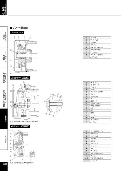 インダクションギアモータG/G3タイプ平行軸H/H2タイプ直交軸F/FAタイプ中空軸・中実軸F2/F3タイプ同心中空軸・同心中実軸技術資料オプション①②③④⑤⑥⑦⑧①②③④⑤⑥⑦⑧⑨⑩⑪⑫⑬⑭⑮⑯⑰⑱①②③④⑤⑥⑦⑧⑨⑩⑪※⑫フィールドアーマチュアファン組スプリング十字穴付六角ボルト六角穴付ボルトファンカバーファンカバー固定ネジg:ギャップ通しボルトモータフレームブラケットステーファンカバー止めねじブレーキファンカバーファン継ぎシャフトファン止めねじマグネットASSYカラーシム皿ねじプレートディスクアーマチュアg:ギャップフィールド付ブラケットスプリングピンアーマチュアファン組スプリング1スプリング2キクナットキーファンカバーファンカバー固定ネジブッシュ十字穴付六角ボルトg:ギャップ1213181114151617■ブレーキ構造図MINIシリーズ③②⑥①⑤④⑦⑧MIDシリーズ(三相)57643218910注.0.1kWは全閉自冷形のためファンはありません。MIDシリーズ(単相)①⑩g⑪③④⑥⑧⑦⑫②⑤⑨注.0.4kWのボルトは六角穴付ボルトです。538