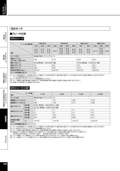 インダクションギアモータG/G3タイプ平行軸H/H2タイプ直交軸F/FAタイプ中空軸・中実軸F2/F3タイプ同心中空軸・同心中実軸技術資料オプション防水モータ■ブレーキ仕様MINIシリーズモータ・出力軸枠番項目ブレーキ方式定格トルクN・m〈於1500〜1800r/min〉電圧〈平均〉V)容量〈75℃〉W)電流〈75℃〉A)許容総仕事量EmaxJブレーキ許容頻度(回/分)三相[200V]15WG-12H-15F-1225WG-12H-15F-1240WG-12H-15F-1225WG-15三相[200V]60WG-15G-18H-18F-1540WG-15G-18H-18F-1590WG-18H-18F-15単相[100V]25W15WG-12H-15F-12G-12H-15F-1225WG-15単相[100V]60WG-1840WG-15G-18H-18F-15無励磁作動形(スプリングクローズ)0.320.72DC90(整流器A200-D90付属)5.80.062.5×107106.90.072.9×1070.320.72DC45整流器A100-D45付属)5.30.122.5×1076.80.142.9×107注1.ブレーキ許容頻度はモータの温度上昇によって制限している大体の目安です。負荷が軽い場合やモータの冷却が充分行われる場合は頻度を上げることができます。(モータの表面温度は90℃以下にしてください。)注2.モータ停止時におけるブレーキコイルへの連続通電はさけてください。注3.ブレーキ電源は付属の整流器をご使用ください。付属の整流器と異なる電源をご使用される場合はお問い合わせください。注4.定格トルクは目安値です。保証値ではありません。MIDシリーズ(三相)項目モータ容量ブレーキ方式静摩擦トルクTsN・m)動摩擦トルクTd(N・m)電圧(平均)V)容量(於75℃)(W)電流(於75℃)(A)200V級400V級200V級400V級200V級400V級0.1kW0.2kW0.4kW0.75kW1.91.52無励磁作動形(スプリングクローズ)1.00.80DC90(整流器A200-D90-UL付属)DC180(整流器A400-D180付属)11120.120.0711120.120.073.923.1415140.170.087.355.8819190.210.11許容総仕事量Emaxブレーキ許容頻度(回/分)(J)1.5×108101.5×1081.5×1084.0×108注1.ブレーキ許容頻度はモータの温度上昇によって制限している大体の目安です。負荷が軽い場合やモータの冷却が充分行われる場合は頻度を上げることができます。注2.モータ停止時におけるブレーキコイルへの連続通電はさけてください。注3.ブレーキ電源は付属の整流器をご使用ください。付属の整流器と異なる電源をご使用になる場合は、お問い合わせください。注4.整流器への入力電圧は次の範囲内で必ずご使用ください。くり返し範囲を超えての運転は故障の要因となりますのでご注意ください。200V級(A200-D90-UL):AC200V~230V400V級(A400-D180):AC380V~480V注5.ブレーキ構造上、モータ運転時にディスクの擦り音が発生することがありますが、ブレーキ性能には特に問題ありません。注6.ブレーキ構造上、インバータで運転するとブレーキ部から騒音が大きくなる場合もありますがブレーキ性能には特に問題ありません。540