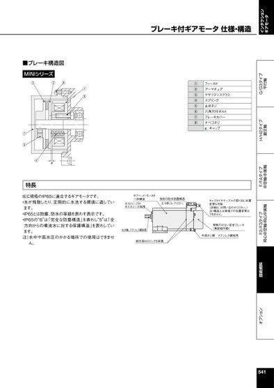 インダクションギアモータオプション技術資料F2/F3タイプ同心中空軸・同心中実軸F/FAタイプ中空軸・中実軸H/H2タイプ直交軸G/G3タイプ平行軸■ブレーキ構造図MINIシリーズ③②⑧①⑥⑦⑤④特長①②③④⑤⑥⑦⑧フィールドアーマチュアマサツディスククミスプリング止めネジ六角穴付ボルトブレーキカバーナベコネジg:ギャップIEC規格のIP65に適合するギアモータです。•水が飛散したり、定期的に水洗する環境に適しています。•IP65とは防塵、防水の等級を表わす表示です。•IP65の“6”は「完全な防塵構造」を表わし“5”は「全方向からの噴流水に対する保護構造」を表わしています。注)水中や高水圧のかかる場所での使用はできません。ギアヘッド・モータを一体構造ダストリップ付オイルシール採用独自の防水防塵構造注)分解しないでください。出力軸ステンレス鋼採用結合部はOリングを装着キャブタイヤケーブルの取り出し位置変更も可能(詳細は、お問い合わせください。)注)構造上お客様での位置変更はできません。発熱の少ない安全ブレーキ(無励磁作動)外部ネジ類ステンレス鋼採用541