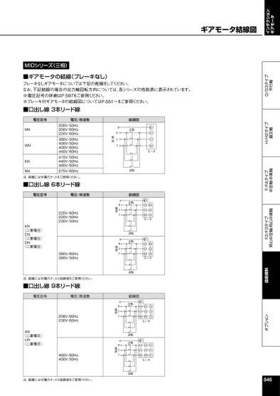 インダクションギアモータオプション技術資料F2/F3タイプ同心中空軸・同心中実軸F/FAタイプ中空軸・中実軸H/H2タイプ直交軸G/G3タイプ平行軸MIDシリーズ(三相)■ギアモータの結線(ブレーキなし)ブレーキなしギアモータについては下記の配線をしてください。なお、下記結線の場合の出力軸回転方向については、各シリーズの性能表に表示されています。※電圧記号の詳細はP.597をご参照ください。※ブレーキ付ギアモータの結線図についてはP.551~をご参照ください。■口出し線3本リード線結線図正転逆転結線図正転逆転正転逆転結線図正転逆転正転逆転U1V1W1モータU1V1W1W2U2V2モータU1W2V1U2W1V2モータU1V1U2V2W1W2X1Y1Z1モータU1V1U2V2W1W2X1Y1Z1モータRST電源TSR電源TSR電源TSR電源TSR電源電圧記号電圧/周波数NNWNENMA200V/50Hz200V/60Hz220V/60Hz380V/50Hz400V/50Hz400V/60Hz440V/60Hz415V/50Hz440V/50Hz480V/60Hz575V/60Hz注.結線には付属のナットをご使用ください。■口出し線6本リード線電圧記号電圧/周波数(二重電圧)(二重電圧)KNCNDN(二重電圧)220V/60Hz220V/50Hz230V/50Hz380V/60Hz380V/50Hz注.結線には付属のナットと短絡板をご使用ください。■口出し線9本リード線電圧記号電圧/周波数ANUN(二重電圧)(二重電圧)208V/60Hz230V/60Hz460V/60Hz400V/50Hz注.結線には付属のナットと短絡板をご使用ください。545