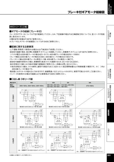 インダクションギアモータオプション技術資料F2/F3タイプ同心中空軸・同心中実軸F/FAタイプ中空軸・中実軸H/H2タイプ直交軸G/G3タイプ平行軸MIDシリーズ(三相)■ギアモータの結線(ブレーキ付)ブレーキ付ギアモータについては下記の配線をしてください。なお、下記結線の場合の出力軸回転方向については、各シリーズの性能表に表示されています。※電圧記号の詳細はP.597をご参照ください。※ブレーキなしギアモータの結線図についてはP.545をご参照ください。■配線に関する注意事項・上下運動(昇降用)で使用される場合は必ず“直流切り”を採用してください。・直流切り結線の場合、接点間に保護素子(オプション)を接続してください。保護素子(オプション)はP.587をご参照ください。(バリスタ電圧は200V級ブレーキの場合423~517V、400V級ブレーキの場合820V~1000V)・ブレーキ電圧は200V級ブレーキの場合DC90V、400V級ブレーキの場合DC180Vです。・ブレーキリード線は200V級ブレーキは青色リード線、400V級ブレーキは黄色リード線です。・直流切り結線を採用された場合、誘導負荷(直流コイル)を遮断するため、DC110V〈DC220V〉、接点定格DC13級における接点容量の接触器をご使用ください。詳細はお問い合わせください。※接点定格DC13級は、コイル負荷に適用する場合のJISC8201-5-1(低圧開閉装置および制御装置)の種別です。※〈〉内は400V級ブレーキの場合です。・整流器にはダイオードが組み込んでありますので、結線間違いなどによりショートさせますと、使用不可能となります。ご注意ください。・インバータを使用される場合の結線および注意事項はP.590をご参照ください。■口出し線3本リード線電圧記号電圧/周波数NN200V/50Hz、200V/60Hz、220V/60HzWNEN380V/50Hz、400V/50Hz400V/60Hz、440V/60Hz415V/50Hz、440V/50Hz480V/60HzMA575V/60HzU1V1W1モータブレーキ正転逆転青(B1・B2)正転逆転白黄整流器A200-D90青青赤黒200V系電源RST電源U1V1W1モータブレーキU1V1W1モータブレーキU1V1W1モータ正転逆転青(B1・B2)青(B1・B2)ブレーキ白黄整流器A200-D90200V系電源RST電源青青赤黒正転逆転N:保護素子OP-ERZV10D471(オプション)正転U1V1W1モータ逆転黄(B1・B2)黄(B1・B2)ブレーキ白黄整流器A400-D180青青赤黒RST電源正転逆転正転U1V1W1モータ逆転青(B1・B2)青(B1・B2)ブレーキ整流器A200-D90-UL(A100-D45)青青赤黒正転逆転白黄RST電源N:保護素子OP-ERZV10D471(オプション)N:保護素子OP-ERZV10D911(オプション)整流器(A200-D90-UL)の青-青は短絡青(B1・B2)整流器(A400-D180)の青-青は短絡黄(B1・B2)整流器(A200-D90-UL)の青-青は短絡青(B1・B2)※結線には付属のナットをご使用ください。551整流器(A400-D180)の青-青は短絡黄(B1・B2)黄(B1・B2)正転逆転黄(B1・B2)正転逆転白黄整流器A400-D180青青赤黒RST電源整流器(A200-D90-UL)の青-青は短絡青(B1・B2)青(B1・B2)ブレーキU1V1W1モータブレーキ正転逆転青(B1・B2)整流器A200-D90-UL(A100-D45)青青赤黒正転逆転白黄RST電源逆転青青赤黒逆転青青赤黒白黄整流器A400-D180正転RST電源U1V1W1モータ白黄正転RST電源整流器A200-D90-UL(A100-D45)交流切り(B)交流切り(A)直流切り