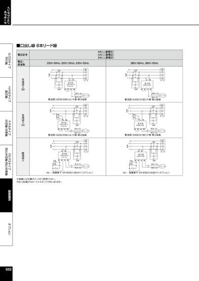 インダクションギアモータG/G3タイプ平行軸H/H2タイプ直交軸F/FAタイプ中空軸・中実軸F2/F3タイプ同心中空軸・同心中実軸技術資料オプションU1V1W1モータブレーキ逆転青青赤黒黄(B1・B2)白黄整流器A400-D180正転RST電源整流器(A400-D180)の青-青は短絡黄(B1・B2)U1V1W1モータブレーキ整流器A200-D90-UL(A100-D45)逆転青青赤黒青(B1・B2)白黄正転RST電源整流器(A200-D90-UL)の青-青は短絡青(B1・B2)U1V1W1モータブレーキ正転逆転黄(B1・B2)正転逆転白黄整流器A400-D180青青赤黒RST電源整流器(A400-D180)の青-青は短絡黄(B1・B2)U1V1W1モータブレーキ正転逆転青(B1・B2)整流器A200-D90-UL(A100-D45)青青赤黒正転逆転白黄RST電源整流器(A200-D90-UL)の青-青は短絡青(B1・B2)正転U1V1W1モータ逆転黄(B1・B2)黄(B1・B2)ブレーキ白黄整流器A400-D180青青赤黒RST電源正転逆転正転U1V1W1モータ逆転青(B1・B2)青(B1・B2)ブレーキ整流器A200-D90-UL(A100-D45)青青赤黒正転逆転白黄RST電源220V/60Hz、220V/50Hz、230V/50Hz380V/60Hz、380V/50HzKN(二重電圧)CN(二重電圧)DN(二重電圧)電圧記号電圧/周波数交流切り(B)交流切り(A)直流切り■口出し線6本リード線N:保護素子OP-ERZV10D471オプション)N:保護素子OP-ERZV10D911(オプション)※結線には付属のナットをご使用ください。※B1,B2端子はターミナルボックス内にあります。552