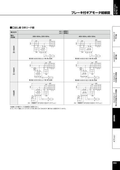 インダクションギアモータオプション技術資料F2/F3タイプ同心中空軸・同心中実軸F/FAタイプ中空軸・中実軸H/H2タイプ直交軸G/G3タイプ平行軸208V/60Hz、230V/60Hz460V/60Hz、400V/50HzAN(二重電圧)UN(二重電圧)U1V1U2V2W1W2X1Y1Z1モータ黄逆転青青赤黒白黄整流器A400-D180正転RST電源U1V1U2V2W1W2X1Y1Z1モータ青整流器A200-D90-UL(A100-D45)逆転青青赤黒白黄正転RST電源整流器(A400-D180)の青-青は短絡ブレーキ黄正転U1V1U2V2W1W2X1Y1Z1モータ逆転黄ブレーキ正転逆転白黄整流器A400-D180青青赤黒RST電源整流器(A400-D180)の青-青は短絡黄正転U1V1U2V2W1W2X1Y1Z1モータ白黄整流器A400-D180RST電源青青赤黒逆転正転逆転黄黄ブレーキ整流器(A200-D90-UL)の青-青は短絡ブレーキ青正転U1V1U2V2W1W2X1Y1Z1モータ逆転青ブレーキ青整流器A200-D90-UL(A100-D45)青青赤黒正転逆転白黄RST電源正転U1V1U2V2W1W2X1Y1Z1モータ整流器A200-D90-UL(A100-D45)白黄RST電源青青赤黒逆転正転逆転青青ブレーキ整流器(A200-D90-UL)の青-青は短絡電圧記号電圧/周波数交流切り(B)交流切り(A)直流切り■口出し線9本リード線N:保護素子OP-ERZV10D471オプション)N:保護素子OP-ERZV10D911(オプション)※結線には付属のナットと短絡板をご使用ください。※ブレーキリード線は、ターミナルボックス内に取り入れてありますが、端子台には固定されていません。553