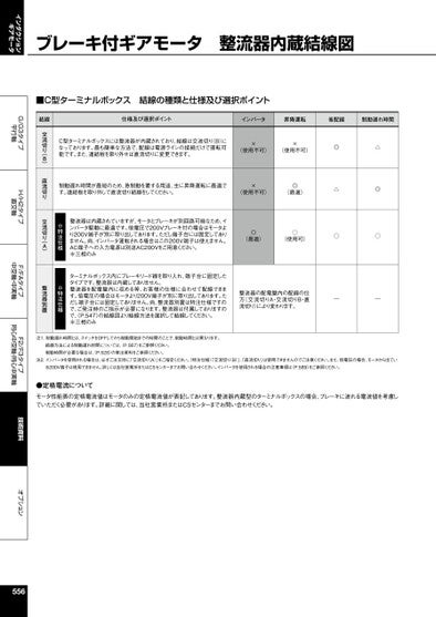 インダクションギアモータG/G3タイプ平行軸H/H2タイプ直交軸F/FAタイプ中空軸・中実軸F2/F3タイプ同心中空軸・同心中実軸技術資料オプション仕様及び選択ポイントインバータ昇降運転省配線制動遅れ時間◎△○△◎○C型ターミナルボックスには整流器が内蔵されており、結線は交流切り(B)になっております。最も簡単な方法で、配線は電源ラインの接続だけで運転可能です。また、連結板を取り外せば直流切りに変更できます。×(使用不可)×(使用不可)制動遅れ時間が最短のため、急制動を要する用途、主に昇降運転に最適です。連結板を取り外して直流切り結線をしてください。×(使用不可)◎(最適)◎(最適)○(使用可)整流器は内蔵されていますが、モータとブレーキが別回路可能なため、インバータ駆動に最適です。倍電圧で200Vブレーキ付の場合はモータより200V端子が別に取り出してあります。ただし端子台には固定してありません。尚、インバータ運転される場合はこの200V端子は使えません。AC端子への入力電源は別途AC200Vをご用意ください。※三相のみ※特注仕様結線交流切り(B)直流切り交流切り(A)■C型ターミナルボックス結線の種類と仕様及び選択ポイント整流器の配電盤内の配線の仕方(交流切りA・交流切りB・直流切り)により変わります。̶̶ターミナルボックス内にブレーキリード線を取り入れ、端子台に固定したタイプです。整流器は内蔵してありません。整流器を配電盤内に収める等、お客様の仕様に合わせて配線できます。倍電圧の場合はモータより200V端子が別に取り出してあります。ただし端子台には固定してありません。尚、整流器別置は特注仕様ですので、ご発注時のご指示が必要になります。整流器は付属しておりますので、P.547〉の結線図より結線方法を選択して結線してください。※三相のみ※特注仕様整流器別置注1.制動遅れ時間とは、スイッチをOFFしてから制動開始までの時間のことで、制動時間とは異なります。結線方法による制動遅れ時間については、P.567〉をご参照ください。制動時間が必要な場合は、P.528〉の算出資料をご参照ください。注2.インバータを使用される場合は、必ずご注文時に「交流切り(A)」をご指定ください。(特注仕様)交流切り(B)」、「直流切り」は使用できませんのでご注意ください。また、倍電圧の場合、モータから出ている200V端子は使用できません。詳しくは当社営業所またはCSセンターまでお問い合わせください。インバータを使用される場合の注意事項は〈P.589〉をご参照ください。●定格電流についてモータ性能表の定格電流値はモータのみの定格電流値が表記してあります。整流器内蔵型のターミナルボックスの場合、ブレーキに流れる電流値を考慮していただく必要があります。詳細に関しては、当社営業所またはCSセンターまでお問い合わせください。ブレーキ付ギアモータ整流器内蔵結線図556
