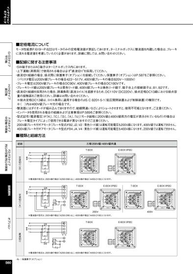 インダクションギアモータG/G3タイプ平行軸H/H2タイプ直交軸F/FAタイプ中空軸・中実軸F2/F3タイプ同心中空軸・同心中実軸技術資料オプション■定格電流についてモータ性能表P.619~P.622はモータのみの定格電流値が表記してあります。ターミナルボックスに整流器を内蔵した場合は、ブレーキに流れる電流値を考慮していただく必要があります。詳細に関しては、お問い合わせください。■配線に関する注意事項・SW端子またはAC端子はターミナルボックス内にあります。・上下運動(昇降用)で使用される場合は必ず“直流切り”を採用してください。・直流切り結線の場合、接点間に保護素子(オプション)を接続してください。保護素子(オプション)はP.587をご参照ください。(バリスタ電圧は200V級ブレーキの場合423~517V、400V級ブレーキの場合820V~1000V)・ブレーキ電圧は200V級ブレーキの場合DC90V、400V級ブレーキの場合DC180Vです。・ブレーキリード線は200V級ブレーキは青色リード線、400V級ブレーキは黄色リード線で、端子台上の接続端子は、B1、B2です。・直流切り結線を採用された場合、誘導負荷(直流コイル)を遮断するため、DC110V〈DC220V〉、接点定格DC13級における接点容量の接触器をご使用ください。詳細はお問い合わせください。※接点定格DC13級は、コイル負荷に適用する場合のJISC8201-5-1(低圧開閉装置および制御装置)の種別です。※〈〉内は400V級ブレーキ付の場合です。・整流器にはダイオードが組み込んでありますので、結線間違いなどによりショートさせますと、使用不可能となります。ご注意ください。・インバータを使用される場合の結線および注意事項はP.589をご参照ください。・型式記号(電源電圧)が「K」、C」、D」、A」、U」モータ銘板に200V級と400V級両方の電圧が表示されているもの)の場合はブレーキ電圧タイプによって使用できる電源が異なりますのでご注意ください。200V級ブレーキ付ギアモータ(ブレーキ型式がB2、J2、V2:青色リード線)は運転可能電圧も200V級になります。400V級では運転できません。400V級ブレーキ付ギアモータ(ブレーキ型式がB4、J4、V4:黄色リード線)は運転可能電圧も400V級になります。200V級では運転できません。■種類と結線方法T-BOXE-BOX(IP65)T-BOXE-BOX(IP65)整流器ACACU1V1W1E-BOX整流器ACAU1V1W1整流器ACACU1V1W1EBOX整流器ACAU1V1W1200V400V正転逆転U1V1W1モータACAC正転逆転RST電源T-BOXE-BOX(IP65)整流器SWSWU1V1W1E-BOX整流器SWSUV1W1U1V1W1モータSWSW正転逆転逆転正転RST電源※整流器の型式は、200V級の場合「A200-D90-UL」、400V級の場合「A400-D180」になります。※整流器の型式は、200V級の場合「A200-D90-UL」、400V級の場合「A400-D180」になります。三相:200V級/400V級共通T-BOXE-BOX(IP65)整流器SWSUV1W1E-BOX※整流器の型式は、200V級の場合「A200-D90-UL」、400V級の場合「A400-D180」になります。整流器SWSUV1W1U1V1W1モータ正転逆転RST電源結線交流切り(B)交流切り(A)直流切り–N–:保護素子(オプション)560