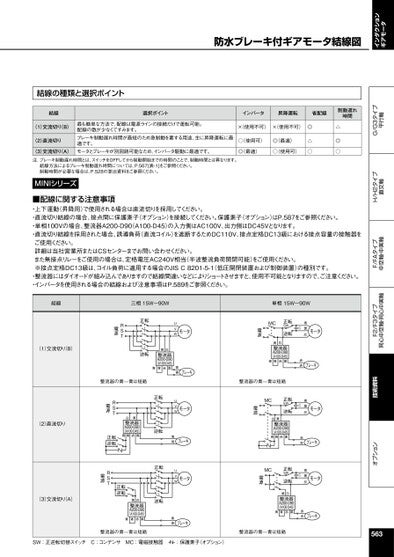 インダクションギアモータオプション技術資料F2/F3タイプ同心中空軸・同心中実軸F/FAタイプ中空軸・中実軸H/H2タイプ直交軸G/G3タイプ平行軸結線の種類と選択ポイント結線選択ポイントインバータ昇降運転省配線(1)交流切り(B)(2)直流切り(3)交流切り(A)最も簡単な方法で、配線は電源ラインの接続だけで運転可能。配線の数が少なくてすみます。ブレーキ制動遅れ時間が最短のため急制動を要する用途、主に昇降運転に最適です。モータとブレーキが別回路可能なため、インバータ駆動に最適です。×(使用不可)×(使用不可)◎○(使用可)◎(最適)◎(最適)○(使用可)△○制動遅れ時間△◎○注.ブレーキ制動遅れ時間とは、スイッチをOFFしてから制動開始までの時間のことで、制動時間とは異なります。結線方法によるブレーキ制動遅れ時間については、P.567[表-1]をご参照ください。制動時間が必要な場合は、P.528の算出資料をご参照ください。MINIシリーズ■配線に関する注意事項・上下運動(昇降用)で使用される場合は直流切りを採用してください。・直流切り結線の場合、接点間に保護素子(オプション)を接続してください。保護素子(オプション)はP.587をご参照ください。・単相100Vの場合、整流器A200-D90(A100-D45)の入力側はAC100V、出力側はDC45Vとなります。・直流切り結線を採用された場合、誘導負荷(直流コイル)を遮断するためDC110V、接点定格DC13級における接点容量の接触器をご使用ください。詳細は当社営業所またはCSセンターまでお問い合わせください。また無接点リレーをご使用の場合は、定格電圧AC240V相当(半波整流負荷開閉可能)をご使用ください。※接点定格DC13級は、コイル負荷に適用する場合のJISC8201-5-1(低圧開閉装置および制御装置)の種別です。・整流器にはダイオードが組み込んでありますので結線間違いなどによりショートさせますと、使用不可能となりますので、ご注意ください。・インバータを使用される場合の結線および注意事項はP.589をご参照ください。結線三相15W~90W単相15W~90W白黄整流器A200-D90(A100-D45)青青赤黒赤赤ブレーキモータ青黒灰C正転SW逆転MC電源モータ青黒灰C正転SW逆転MC電源白黄整流器の青̶青は短絡モータUVW青青ブレーキモータUVW整流器A200-D90(A100-D45)黒青青赤赤赤ブレーキ黄白整流器A200-D90(A100-D45)青青赤黒赤赤ブレーキモータ青黒灰C正転SW逆転MC電源青青ブレーキモータUVW青青ブレーキ逆転白黄整流器A200-D90(A100-D45)青青赤黒整流器の青̶青は短絡正転RST電源正転逆転正転逆転黄白整流器A200-D90(A100-D45)黒青青赤RST電源正転逆転白黄整流器A200-D90(A100-D45)青青赤黒正転逆転RST電源(1)交流切り(B)(2)直流切り(3)交流切り(A)SW:正逆転切替スイッチC:コンデンサMC:電磁接触器N:保護素子(オプション)整流器の青̶青は短絡整流器の青̶青は短絡563