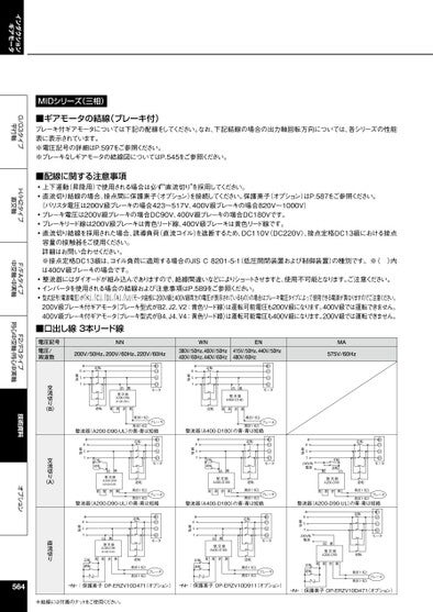 インダクションギアモータG/G3タイプ平行軸H/H2タイプ直交軸F/FAタイプ中空軸・中実軸F2/F3タイプ同心中空軸・同心中実軸技術資料オプションMIDシリーズ(三相)■ギアモータの結線(ブレーキ付)ブレーキ付ギアモータについては下記の配線をしてください。なお、下記結線の場合の出力軸回転方向については、各シリーズの性能表に表示されています。※電圧記号の詳細はP.597をご参照ください。※ブレーキなしギアモータの結線図についてはP.545をご参照ください。■配線に関する注意事項・上下運動(昇降用)で使用される場合は必ず“直流切り”を採用してください。・直流切り結線の場合、接点間に保護素子(オプション)を接続してください。保護素子(オプション)はP.587をご参照ください。(バリスタ電圧は200V級ブレーキの場合423~517V、400V級ブレーキの場合820V~1000V)・ブレーキ電圧は200V級ブレーキの場合DC90V、400V級ブレーキの場合DC180Vです。・ブレーキリード線は200V級ブレーキは青色リード線、400V級ブレーキは黄色リード線です。・直流切り結線を採用された場合、誘導負荷(直流コイル)を遮断するため、DC110V〈DC220V〉、接点定格DC13級における接点容量の接触器をご使用ください。詳細はお問い合わせください。※接点定格DC13級は、コイル負荷に適用する場合のJISC8201-5-1(低圧開閉装置および制御装置)の種別です。※〈〉内は400V級ブレーキの場合です。・整流器にはダイオードが組み込んでありますので、結線間違いなどによりショートさせますと、使用不可能となります。ご注意ください。・インバータを使用される場合の結線および注意事項はP.589をご参照ください。・型式記号(電源電圧)が「K」、C」、D」、A」、U」(モータ銘板に200V級と400V級両方の電圧が表示されているもの)の場合はブレーキ電圧タイプによって使用できる電源が異なりますのでご注意ください。200V級ブレーキ付ギアモータ(ブレーキ型式がB2、J2、V2:青色リード線)は運転可能電圧も200V級になります。400V級では運転できません。400V級ブレーキ付ギアモータ(ブレーキ型式がB4、J4、V4:黄色リード線)は運転可能電圧も400V級になります。200V級では運転できません。■口出し線3本リード線電圧記号電圧/周波数NN200V/50Hz、200V/60Hz、220V/60HzWNEN380V/50Hz、400V/50Hz400V/60Hz、440V/60Hz415V/50Hz、440V/50Hz480V/60HzMA575V/60HzU1V1W1モータブレーキ正転逆転青(B1・B2)正転逆転白黄整流器A200-D90青青赤黒200V系電源RST電源整流器(A200-D90-UL)の青-青は短絡青(B1・B2)U1V1W1モータ正転逆転青(B1・B2)青(B1・B2)ブレーキ白黄整流器A200-D90200V系電源RST電源青青赤黒正転逆転N:保護素子OP-ERZV10D471(オプション)U1V1W1モータブレーキU1V1W1モータブレーキ交流切り(B)交流切り(A)直流切り整流器(A400-D180)の青-青は短絡黄(B1・B2)黄(B1・B2)黄(B1・B2)正転逆転黄(B1・B2)正転逆転白黄整流器A400-D180青青赤黒RST電源整流器(A200-D90-UL)の青-青は短絡青(B1・B2)青(B1・B2)ブレーキU1V1W1モータブレーキ青(B1・B2)正転逆転青(B1・B2)正転逆転白黄整流器A200-D90(A100-D45)青青赤黒RST電源逆転青青赤黒逆転青青赤黒白黄整流器A400-D180正転RST電源U1V1W1モータ白黄整流器A200-D90(100-D45)正転RST電源正転U1V1W1モータ逆転黄(B1・B2)黄(B1・B2)ブレーキ白黄整流器A400-D180青青赤黒RST電源正転逆転正転U1V1W1モータ逆転青(B1・B2)青(B1・B2)ブレーキ白黄整流器A200-D90(A100-D45)RST電源青青赤黒正転逆転整流器(A200-D90-UL)の青-青は短絡整流器(A400-D180)の青-青は短絡564N:保護素子OP-ERZV10D471(オプション)N:保護素子OP-ERZV10D911(オプション)※結線には付属のナットをご使用ください。