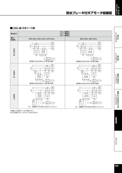 インダクションギアモータオプション技術資料F2/F3タイプ同心中空軸・同心中実軸F/FAタイプ中空軸・中実軸H/H2タイプ直交軸G/G3タイプ平行軸U1V1W1モータブレーキ逆転青青赤黒黄(B1・B2)白黄整流器A400-D180正転RST電源整流器(A400-D180)の青-青は短絡黄(B1・B2)U1V1W1モータブレーキ逆転青青赤黒青(B1・B2)白黄整流器A200-D90(A100-D45)正転RST電源整流器(A200-D90-UL)の青-青は短絡青(B1・B2)220V/60Hz、220V/50Hz、230V/50Hz380V/60Hz、380V/50HzKN(二重電圧)CN(二重電圧)DN(二重電圧)U1V1W1モータブレーキ正転逆転黄(B1・B2)正転逆転白黄整流器A400-D180青青赤黒RST電源整流器(A400-D180)の青-青は短絡黄(B1・B2)U1V1W1モータブレーキ正転逆転青(B1・B2)正転逆転白黄整流器A200-D90(A100-D45)青青赤黒RST電源整流器(A200-D90-UL)の青-青は短絡青(B1・B2)正転U1V1W1モータ逆転黄(B1・B2)黄(B1・B2)ブレーキ白黄整流器A400-D180青青赤黒RST電源正転逆転正転U1V1W1モータ逆転青(B1・B2)青(B1・B2)ブレーキ白黄整流器A200-D90(A100-D45)青青赤黒RST電源正転逆転N:保護素子OP-ERZV10D471オプション)N:保護素子OP-ERZV10D911(オプション)電圧記号電圧/周波数交流切り(B)交流切り(A)直流切り■口出し線6本リード線※結線には付属のナットをご使用ください。※B1,B2端子はターミナルボックス内にあります。565
