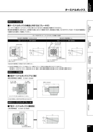 インダクションギアモータオプション技術資料F2/F3タイプ同心中空軸・同心中実軸F/FAタイプ中空軸・中実軸H/H2タイプ直交軸G/G3タイプ平行軸571MIDシリーズ(三相)■ターミナルボックスの構造と外形寸法(ブレーキ付)ブレーキリード線はターミナルボックス内に取り入れてあります。整流器は内蔵されておりません。整流器を配電盤内に収めるなど、お客様の仕様に合わせて配線できます。整流器は付属しておりますので、P.551~P.553の結線図より結線方法を選択して結線してください。ブレーキ付ギアモータターミナルボックス詳細・寸法図型式記号(電源電圧)N,W,K,C,E,MT型ターミナルボックス標準(鋼板製)M4スタッドボルト型式記号(電源電圧)AT型ターミナルボックス標準(鋼板製)ブレーキリード線M4スタッドボルト102102φ2746(3)92X1Y1Z1U2V2W2U1V1W1φ2746(3)92B2B1UVW1アース用端子M4十字穴付六角ボルトブレーキリード線は端子台(B1・B2)に固定してあります。※型式記号(電源電圧)の詳細はP.597をご参照ください。アース用端子M4十字穴付六角ボルトブレーキリード線は端子台に固定してありません。注.型式記号(電源電圧)が「K」、「C」の場合は、ブレーキ電圧タイプによって使用できる電源が異なりますのでご注意ください。200V級ブレーキ付ギアモータ(ブレーキ型式がB2、J2、V2:青色リード線)は運転可能電圧も200V級になります。400V級では運転できません。400V級ブレーキ付ギアモータ(ブレーキ型式がB4、J4、V4:黄色リード線)は運転可能電圧も400V級になります。200V級では運転できませんMIDシリーズ(単相)■A型ターミナルボックス(アルミ製)単相/標準電圧・倍電圧0.1kW~0.4kWモータリード線丸端子M4用※アース端子丸端子M4用※コンデンサラン形には丸端子は付いていません。注.図は代表図により端子形状が異なるものもあります。MIDシリーズ(クラッチ/ブレーキ)■T型ターミナルボックス(鋼板製)三相/標準電圧0.1kW~0.75kW適合コードφ8-φ1228□7061102φ2746(3)アース用端子M4十字穴付六角ボルトM4スタッドボルト92U1V1W1