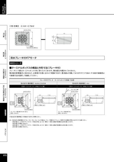 インダクションギアモータG/G3タイプ平行軸H/H2タイプ直交軸F/FAタイプ中空軸・中実軸F2/F3タイプ同心中空軸・同心中実軸技術資料オプション■ターミナルボックスの構造と外形寸法(ブレーキ付)ブレーキリード線はターミナルボックス内に取り入れてあります。整流器は内蔵されておりません。整流器を配電盤内に収めるなど、お客様の仕様に合わせて配線できます。整流器は付属しておりますので、P.564~P.566の結線図より結線方法を選択して結線してください。ブレーキ付ギアモータターミナルボックス詳細・寸法図102φ2746(3)アース用端子M4十字穴付六角ボルト92X1Y1Z1U2V2W2U1V1W1三相/倍電圧0.1kW~0.75kWM4スタッドボルト防水ブレーキ付ギアモータMIDシリーズ型式記号(電源電圧)A,UE型ターミナルボックスIP65(アルミ製)ブレーキリード線M4スタッドボルト45□105X1Y1Z1U2VW2U1V1W1(35)□105(35)□105適合コード径φ8~φ12E-BOX適合コード径φ8~φ12型式記号(電源電圧)N,W,K,C,D,E,ME型ターミナルボックスIP65(アルミ製)45□105M4スタッドボルトBB1U1V1W1E-BOXアース用端子M4十字穴付六角ボルトブレーキリード線は端子台(B1・B2)に固定してあります。※型式記号(電源電圧)の詳細はP.597をご参照ください。アース用端子M4十字穴付六角ボルトブレーキリード線は端子台に固定してありません。注1.型式記号(電源電圧)が「K」、C」、「D」、A」、「U」の場合は、ブレーキ電圧タイプによって使用できる電源が異なりますのでご注意ください。200V級ブレーキ付ギアモータ(ブレーキ型式がB2、J2、V2:青色リード線)は運転可能電圧も200V級になります。400V級では運転できません。400V級ブレーキ付ギアモータ(ブレーキ型式がB4、J4、V4:黄色リード線)は運転可能電圧も400V級になります。200V級では運転できません。572