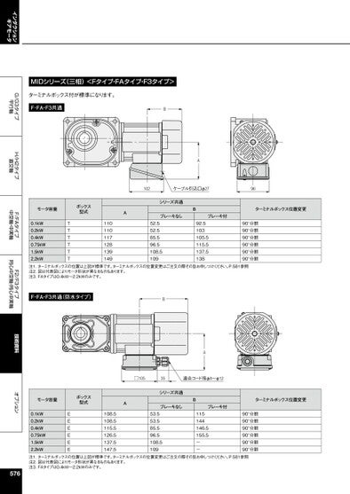 インダクションギアモータG/G3タイプ平行軸H/H2タイプ直交軸F/FAタイプ中空軸・中実軸F2/F3タイプ同心中空軸・同心中実軸技術資料オプションMIDシリーズ(三相)<Fタイプ・FAタイプ・F3タイプ>ターミナルボックス付が標準になります。F・FA・F3共通BA102ケーブル引込口φ2796モータ容量ボックス型式Aシリーズ共通Bブレーキなしブレーキ付ターミナルボックス位置変更0.1kW0.2kW0.4kW0.75kW1.5kW2.2kWTTTTTT11011011712813914952.552.585.596.5108.510992.5103105.5115.5137.513890°分割90°分割90°分割90°分割90°分割90°分割注1.ターミナルボックスの位置は上図が標準です。ターミナルボックスの位置変更はご注文の際その旨お申しつけください。P.581参照注2.図は代表図によりモータ形状が異なるものもあります。注3.FAタイプは0.4kW~2.2kWのみです。F・FA・F3共通(防水タイプ)BA□10535適合コード径φ8~φ12シリーズ共通Bブレーキなしブレーキ付ターミナルボックス位置変更53.553.585.596.5108.5109115144146.5155.5--90°分割90°分割90°分割90°分割90°分割90°分割モータ容量ボックス型式A0.1kW0.2kW0.4kW0.75kW1.5kW2.2kWEEEEEE108.5108.5115.5126.5137.5147.5注1.ターミナルボックスの位置は上図が標準です。ターミナルボックスの位置変更はご注文の際その旨お申しつけください。P.581参照注2.図は代表図によりモータ形状が異なるものもあります。注3.FAタイプは0.4kW~2.2kWのみです。576