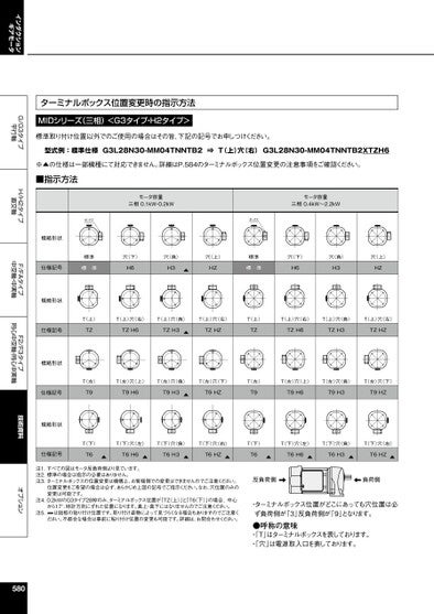 インダクションギアモータG/G3タイプ平行軸H/H2タイプ直交軸F/FAタイプ中空軸・中実軸F2/F3タイプ同心中空軸・同心中実軸技術資料オプションターミナルボックス位置変更時の指示方法MIDシリーズ(三相)<G3タイプ・H2タイプ>標準取り付け位置以外でのご使用の場合はその旨、下記の記号でお申しつけください。型式例:標準仕様G3L28N30-MM04TNNTB2⇒T(上)穴(右)G3L28N30-MM04TNNTB2XTZH6※▲の仕様は一部機種にて対応できません。詳細はP.584のターミナルボックス位置変更の注意事項をご確認ください。■指示方法ボックス標準標準概略形状仕様記号概略形状モータ容量三相0.1kW・0.2kWモータ容量三相0.4kW~2.2kWボックス穴(下)穴(負)H6H3▲穴(上)HZ標準標準穴(下)H6穴(負)H3穴(上)HZT上)T(上)穴(右)T(上)穴(負)T(上)穴(左)T(上)T上)穴(右)T上)穴(負)T(上)穴(左)仕様記号TZTZH6TZH3▲TZHZTZTZH6TZH3TZHZ概略形状T左)T(左)穴(上)T(左)穴(負)T(左)穴(下)T(左)T左)穴(上)T左)穴(負)T(左)穴(下)仕様記号T9T9H6T9H3▲T9HZT9T9H6T9H3T9HZ概略形状仕様記号T下)T(下)穴(左)T(下)穴(負)T(下)穴(右)T(下)T下)穴(左)T下)穴(負)T(下)穴(右)T6▲T6H6▲T6H3▲T6HZ▲T6▲T6H6▲T6H3▲T6HZ▲注1.すべての図はモータ反負荷側より見ています。注2.標準の場合は指示の必要はありません。注3.ターミナルボックスの位置変更は機構上、お客様側での変更はできませんのでご注意ください。位置変更をご希望の場合は必ず、あらかじめ上図の記号でご指示ください。なお、穴位置のみの変更は可能です。注4.0.2kWのG3タイプ28枠のみ、ターミナルボックス位置が「TZ(上)」と「T6(下)」の場合、中心注5.から17°、時計方向にずれた位置になります。真上・真下にはなりませんのでご注意ください。は銘板の貼り付け位置です。取り付け姿勢によって見づらくなる場合もありますのでご注意ください。不都合な場合は事前に貼り付け位置の変更も可能です。詳細は、お問合わせください。反負荷側負荷側・ターミナルボックス位置がどこにあっても穴位置は必ず負荷側が「3」反負荷側が「9」となります。●呼称の意味・「T」はターミナルボックスを表しております。・「穴」は電源取入口を表しております。580