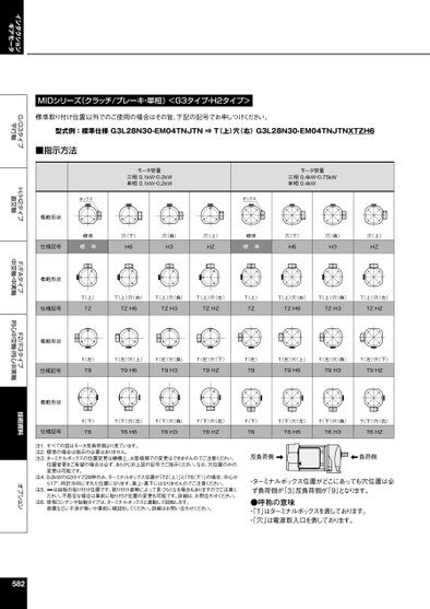 インダクションギアモータG/G3タイプ平行軸H/H2タイプ直交軸F/FAタイプ中空軸・中実軸F2/F3タイプ同心中空軸・同心中実軸技術資料オプションMIDシリーズ(クラッチ/ブレーキ・単相)<G3タイプ・H2タイプ>標準取り付け位置以外でのご使用の場合はその旨、下記の記号でお申しつけください。型式例:標準仕様G3L28N30-EM04TNJTN⇒T(上)穴(右)G3L28N30-EM04TNJTNXTZH6■指示方法概略形状仕様記号概略形状モータ容量三相0.1kW・0.2kW単相0.1kW・0.2kWモータ容量三相0.4kW・0.75kW単相0.4kWボックスボックス標準標準穴(下)H6穴(負)H3穴(上)HZ標準標準穴(下)H6穴(負)H3穴(上)HZT(上)T(上)穴(右)T(上)穴(負)T上)穴(左)T(上)T(上)穴(右)T(上)穴(負)T(上)穴(左)仕様記号TZTZH6TZH3TZHZTZTZH6TZH3TZHZ概略形状T(左)T(左)穴(上)T(左)穴(負)T左)穴(下)T(左)T(左)穴(上)T(左)穴(負)T(左)穴(下)仕様記号T9T9H6T9H3T9HZT9T9H6T9H3T9HZ概略形状T(下)T(下)穴(左)T下)穴(負)T下)穴(右)T(下)T(下)穴(左)T(下)穴(負)T(下)穴(右)仕様記号T6T6H6T6H3T6HZT6T6H6T6H3T6HZ注1.すべての図はモータ反負荷側より見ています。注2.標準の場合は指示の必要はありません。注3.ターミナルボックスの位置変更は機構上、お客様側での変更はできませんのでご注意ください。位置変更をご希望の場合は必ず、あらかじめ上図の記号でご指示ください。なお、穴位置のみの変更は可能です。注4.0.2kWのG3タイプ28枠のみ、ターミナルボックス位置が「TZ(上)」と「T6(下)」の場合、中心から17°、時計方向にずれた位置になります。真上・真下にはなりませんのでご注意ください。は銘板の貼り付け位置です。取り付け姿勢によって見づらくなる場合もありますのでご注意ください。不都合な場合は事前に貼り付け位置の変更も可能です。詳細は、お問合わせください。注5.注6.単相コンデンサ始動タイプは、ターミナルボックスと連動して回転します。装置などに干渉が無いか事前に確認をしてください。詳細はお問い合わせください。反負荷側負荷側・ターミナルボックス位置がどこにあっても穴位置は必ず負荷側が「3」反負荷側が「9」となります。●呼称の意味・「T」はターミナルボックスを表しております。・「穴」は電源取入口を表しております。582