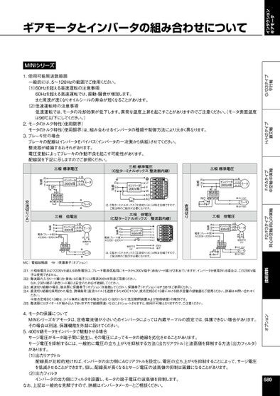 インダクションギアモータオプション技術資料F2/F3タイプ同心中空軸・同心中実軸F/FAタイプ中空軸・中実軸H/H2タイプ直交軸G/G3タイプ平行軸ギアモータとインバータの組み合わせについてMINIシリーズ1.使用可能周波数範囲一般的には、5~120Hzの範囲でご使用ください。(1)60Hzを超える高速運転の注意事項60Hzを超える高速運転では、振動・騒音が増加します。また周速が速くなりオイルシールの寿命が短くなることがあります。(2)低速運転時の注意事項低速運転では、モータの冷却効果が低下します。異常な温度上昇を起こすことがありますのでご注意ください。モータ表面温度は90℃以下にしてください。)2.モータのトルク特性(使用限界)モータのトルク特性(使用限界)は、組み合わせるインバータの種類や制御方法により大きく異なります。モータ黒灰白UVWインバータ200V用三相標準電圧白黄整流器A200-D90(A100-D45)青青赤黒青(B1・B2)ブレーキ青(B1・B2)MCRST電源黄白整流器A200-D90赤黒青青MC赤赤(B)B)使用不可(注)青(B1・B2)ブレーキ青(B1・B2)モータ黒茶白UVWインバータ400V用三相倍電圧RST電源電源(ブレーキ用)AC200~220V3.ブレーキ付の場合ブレーキの配線はインバータをバイパス(インバータの一次側から供給)させてください。整流器が破損するおそれがあります。電圧変動によってブレーキの作動不良を起こす可能性があります。配線図を下記に示しますのでご参照ください。三相標準電圧三相標準電圧(C型ターミナルボックス整流器内蔵)直流切り注.C型ターミナルボックス「交流切り(A)」は特注仕様ですので、ご発注時のご指示が必要になります。三相倍電圧(C型ターミナルボックス整流器内蔵)整流器内蔵ACWVUACUVWACACインバータ200V用MCRST電源青青ブレーキモータ黒灰白UVWインバータ200V用MC白黄整流器A200-D90(A100-D45)青青赤黒RST電源三相倍電圧注.C型ターミナルボックス「交流切り(A)」は特注仕様ですので、ご発注時のご指示が必要になります。赤赤200V端子UVWACACインバータ400V用MC使用不可(注)電源(ブレーキ用)AC200~220VRST電源モータ黒茶白UVWインバータ400V用RST電源電源(ブレーキ用)AC200~220VMC黄白整流器A200-D90赤黒青青赤赤使用不可(注)青青ブレーキ交流切り(A)MC:電磁接触器-N-:保護素子(オプション)注1.三相倍電圧および220Vを超える特殊電圧は、ブレーキ電源供給用にモータから200V端子(赤色リード線)が2本出ていますが、インバータを使用される場合は、この200V端注2.整流器の入力リード線(白・黄色/AC端子)には電源200Vを別途ご用意ください。なお、200V端子(赤色リード線)は安全のため必ず絶縁してください。注3.直流切り結線の場合、接点間に保護素子(オプション)を接続してください。保護素子(オプション)はP.587をご参照ください。注4.直流切り結線を採用された場合、誘導負荷(直流コイル)を遮断するためDC110V、接点定格DC13級における接点容量の接触器をご使用ください。詳細はお問い合わせく子は使用できません。ださい。※接点定格DC13級は、コイル負荷に適用する場合のJISC8201-5-1(低圧開閉装置および制御装置)の種別です。注5.整流器にはダイオードが組み込んでありますので結線間違いなどによりショートさせますと、使用不可能となりますので、ご注意ください。4.モータの保護についてMINIシリーズギアモータは、定格電流値が小さいためインバータによっては内蔵サーマルの設定では、保護できない場合があります。その場合は別途、保護機能を外部に設けてください。5.400V級モータをインバータで駆動させる場合サージ電圧がモータ端子間に発生し、その電圧によってモータの絶縁を劣化させることがあります。サージ電圧を抑制するには、一般的に電圧の立ち上がりを抑制する方法(出力リアクトル)と波高値を抑制する方法(出力フィルタ)があります。(1)出力リアクトル配線長が比較的短ければ、インバータの出力側にACリアクトルを設定し、電圧の立ち上がりを抑制することによって、サージ電圧を低減させることができます。但し、配線長が長くなるとサージ電圧の波高値の抑制は困難になることがあります。(2)出力フィルタインバータの出力側にフィルタを設置し、モータの端子電圧の波高値を抑制します。なお、上記は一般的な見解ですので、詳細はインバータメーカーとご相談ください。589