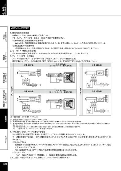 インダクションギアモータG/G3タイプ平行軸H/H2タイプ直交軸F/FAタイプ中空軸・中実軸F2/F3タイプ同心中空軸・同心中実軸技術資料オプション60Hzを超える高速運転では、振動・騒音が増加します。また周速が速くなりオイルシールの寿命が短くなることがあります。(2)低速運転時の注意事項低速運転では、モータの冷却効果が低下しますので異常な温度上昇を起こすことがありますのでご注意ください。2.モータのトルク特性(使用限界)モータのトルク特性(使用限界)は、組み合わせるインバータの種類や制御方法により大きく異なります。3.ブレーキ付ギアモータの場合ブレーキの配線はインバータをバイパスさせてください。インバータの一次側から供給)電圧変動によってブレーキの作動不良を起こす可能性があります。配線例を下記に記しますのでご参照ください。三相200V級三相200V級(ターミナルボックス整流器内蔵)三相200V級白黄整流器A200-D90-UL青青赤黒インバータ200V用U1V1W1モータ青(B1・B2)青(B1・B2)ブレーキ三相400V級白黄整流器A400-D180青青赤黒インバータ400V用U1V1W1モータ黄(B1・B2)黄(B1・B2)ブレーキRST電源MCRST電源MC直流切り三相400V級三相400V級(ターミナルボックス整流器内蔵)整流器A200-D90-ULAUV1AW1インバータ200V用MCU1V1W1モータACACRST電源インバータ200V用U1V1W1モータ青(B1・B2)青(B1・B2)ブレーキMC白黄整流器A200-D90-UL青青赤黒整流器A400-180AU1V1ACW1インバータ400V用MCU1V1W1モータACACRST電源インバータ400V用U1V1W1モータ黄(B1・B2)黄(B1・B2)ブレーキMC白黄整流器A400-D180青青赤黒RST電源RST電源交流切り(A)MC:電磁接触器-N-:保護素子(オプション)MIDシリーズ(三相)1.使用可能周波数範囲一般的には、5~120Hzの範囲でご使用ください。クラッチ/ブレーキ付ギアモータは、5~60Hzの範囲でご使用ください。(1)60Hzを超える高速運転の注意事項注1.B1,B2端子またはAC端子はターミナルボックス内にあります。注2.直流切り結線の場合、接点間に保護素子(オプション)を接続してください。保護素子(オプション)はP.587をご参照ください。注3.直流切り結線を採用された場合、誘導負荷(直流コイル)を遮断するためDC110V〈DC220V〉、接点定格DC13級における接点容量の接触器をご使用ください。詳細はお問い合わせください。※接点定格DC13級は、コイル負荷に適用する場合のJISC8201-5-1低圧開閉装置および制御装置)の種別です。※〈〉内は400級ブレーキ付(ブレーキリード線:黄色)の場合です。4.400V級モータをインバータで運転する場合サージ電圧がモータ端子間に発生し、その電圧によってモータの絶縁を劣化させることがあります。サージ電圧を抑制するには、一般的に電圧の立ち上がりを抑制する方法(出力リアクトル)と波高値を抑制する方法(出力フィルタ)があります。(1)出力リアクトル配線長が比較的短ければ、インバータの出力側にACリアクトルを設定し、電圧の立ち上がりを抑制することによって、サージ電圧を低減させることができます。但し、配線長が長くなるとサージ電圧の波高値の抑制は困難になることがあります。(2)出力フィルタインバータの出力側にフィルタを設置し、モータの端子電圧の波高値を抑制します。なお、上記は一般的な見解ですので、詳細はインバータメーカーとご相談ください。590