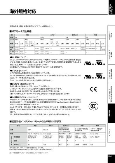 インダクションギアモータオプション技術資料F2/F3タイプ同心中空軸・同心中実軸F/FAタイプ中空軸・中実軸H/H2タイプ直交軸G/G3タイプ平行軸海外規格対応世界の指令、規格、制度に適合したギアモータを提供します。■ギアモータ安全規格国名規格シリーズULMINI相数単相三相米国MID単相(コンデンサラン)単相(コンデンサ始動)規格No.ULFileNo.UL1004-1UL1004-3UL1004-1―XEWR2.E141674PRGY2.E172621―CSAMINI三相単相三相カナダMID単相(コンデンサラン)単相(コンデンサ始動)UL1004-1C22.№100C22.№77C22.2№100―PRGY2.E172621XEWR8.E141674PRGY8.E172621―欧州(EU)MIDENMINIGBMINI中国MID三相単相三相単相三相単相三相単相三相C22.2№100EN60034-1EN60034-1―EN60034-1EN60034-5GB/T12350-2022―GB/T12350-2022PRGY8.E172621――●UL規格についてULとは、「UnderwritersLaboratoriesInc.」の略称で、1894年にアメリカの火災保険業者組合が火災、災害、その他の事故から人命、財産を守る目的で設立した民間の検査機関です。あらゆる製品、部品、材料について試験、認定を行っています。UL規格はアメリカのほとんどの州で使用が許可されている安全規格です。●CSA規格についてカナダではCSA規格の使用が法律で定められています。ULはCSA規格の認証機関として認められており、CSA規格に適合していることが認められれば「cUL」マークの表示を許可します。「cUL」マークの表示によりカナダでの使用は許可されます。●EU指令・EN規格について欧州へ輸出する機械には「CEマーキング」が必要です。このCEマーキングを行うにはEU指令への適合が義務づけられています。EU指令への適合を証明するにはEN規格への適合が原則となります。(株)ニッセイのCEマーキングギアモータは、EU指令への適合を自己宣言しています。●GB規格(CCCマーク)について中国では、WTOの加盟を機に、国内流通製品の認証制度を統一し、中国国内で流通する対象品目に対しCCCマークの表示を義務付けた中国強制認証制度(ChinaCompulsoryCertification)が2003年8月より運用開始となりました。ニッセイのギアモータとしては、容量0.75kW以下のインダクションモータ付製品が対象となります。対象ギアモータ単体で中国へ輸出する場合にはギアモータそのものがCCC認証品であることが必須です。但し、装置組込みで装置全体にてCCC取得できれば、必ずしも必要ではありません。■低圧三相インダクションモータの効率規制対応状況欧州(EU)COMMISSIONREGULATION(EU)2019/1781中国韓国モータ高効率規格値と高効率等級エネルギー消費効率等級表示制度NEMAMG1-12-120.75kW/1HP~2.2kW/3HPCSAC3900.75kW/1HP~2.2kW/3HPIEC60034-1:20170.2kW~0.4kW0.75kW~2.2kWGB18613-20200.2kW~0.4kW(注1)0.75~2.2kWKSC42020.75~2.2kW4IE34IE34IE24IE3444GB3級GB3級IE3国名米国カナダEISAEEAct容量範囲極数効率クラス法律規格当社対応内容•当社対応内容は、ギアモータの効率規制を対象としております。•上記の内容は、規格内容の変更などに伴い、予告なしに変更することがあります。注1.中国GB3級の0.2kW~0.4kWはオプションにて対応しております。591
