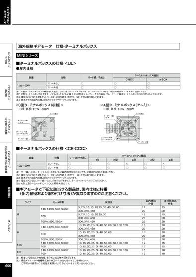 インダクションギアモータG/G3タイプ平行軸H/H2タイプ直交軸F/FAタイプ中空軸・中実軸F2/F3タイプ同心中空軸・同心中実軸技術資料オプション海外規格ギアモータ仕様・ターミナルボックスMINIシリーズ■ターミナルボックスの仕様<UL>●屋内仕様容量仕様リード線バラ出しターミナルボックス種別C-BOXA-BOX15W〜90Wブレーキなしブレーキ付○○○○○○注1.C型ターミナルボックスは樹脂製、A型ターミナルボックスはアルミ製です。ターミナルボックス付をご希望の場合は、いずれかご選択ください。注2.C型ターミナルボックス・A型ターミナルボックスともに端子台は付きません。ブレーキ付の場合、ブレーキリード線はターミナルボックス内に取り込んであります。注3.電圧220Vを超える場合は、モータより200V端子(赤色リード線)が別に取り出してあります。注4.防水タイプは国内仕様と同じキャブタイヤケーブルになります。<C型ターミナルボックス(樹脂)>三相・単相15W~90Wアース端子<A型ターミナルボックス(アルミ)>三相・単相15W~90Wモータリード線U・V・Wアース端子モータリード線U・V・Wブレーキリード線(ブレーキ付のみ)アースリード線ブレーキリード線(ブレーキ付のみ)アースリード線■ターミナルボックスの仕様<CE・CCC>容量仕様リード線バラ出し15W〜90Wブレーキなしブレーキ付○○ターミナルボックス種別T型K型C型A型Z型○○○○×○○○×○注1.リード線バラ出し、ターミナルボックス付ともに国内標準仕様と同じです。詳細はP.601をご参照ください。注2.電圧220Vを超える場合は、モータより200V端子(赤色リード線)が別に取り出してあります。注3.防水タイプは国内仕様と同じキャブタイヤケーブルになります。注4.電圧400V級は、リード線バラ出しの製作はできません。ターミナルボックス付でご指示ください。注5.A型、Z型ターミナルボックスはCCC規格未対応です。■ギアモータで下記に該当する製品は、国内仕様と枠番(出力軸径および取り付け寸法)が異なりますのでご注意ください。タイプモータ呼称減速比国内仕様枠番海外規格品枠番GHF2SF2FT40、T40W、S40、S40WT60T60W、S60、S60WT40、T40W、S40、S40WT60T60W、S60、S60WT40、T40W、S40、S40WT60T40、T40W、S40、S40WT605、7.5、10、15、20、25、30、40、50、60300、375、4505、7.5、10、15、20、25、30300、375、450300、375、45010、15、20、25、30、40、50、60、80、100、120300、375、45010、15、20、25、30、40、50、60300、375、450300、375、45010、15、20、25、30、40、50、60、80、100、12010、15、20、25、30、40、50、6010、15、20、25、30、40、50、60、80、100、12010、15、20、25、30、40、50、6012221222221522152222121215151528152828182818282815151818注1.枠番はF2Sは出力軸内径、その他は出力軸外径を示します。注2.規格ギアモータの機種構成表P.602~P.605も合わせてご参照ください。ご不明点は最寄りの当社各営業所またはCSセンターまでお問い合わせください。600