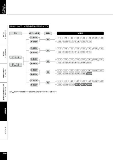 インダクションギアモータG/G3タイプ平行軸H/H2タイプ直交軸F/FAタイプ中空軸・中実軸F2/F3タイプ同心中空軸・同心中実軸技術資料オプションMINIシリーズ<同心中空軸/F2Sタイプ>型式4Pモータ容量枠番減速比ギアモータブレーキ付ギアモータ三相15W単相15W三相25W単相25W三相40W単相40W三相60W単相60W三相90W単相90W12121515151/101/801/101/801/101/801/101/801/101/801/151/201/251/301/401/501/601/1001/1201/1601/2001/2401/151/201/251/301/401/501/601/1001/1201/1601/2001/2401/151/201/251/301/401/501/601/1001/1201/1601/2001/2401/151/201/251/301/401/501/601/1001/1201/1601/2001/2401/151/201/251/301/401/501/601/1001/1201/1601/2001/240注.はトルク制限機種です。性能表の出力軸許容トルクに特にご注意ください。604