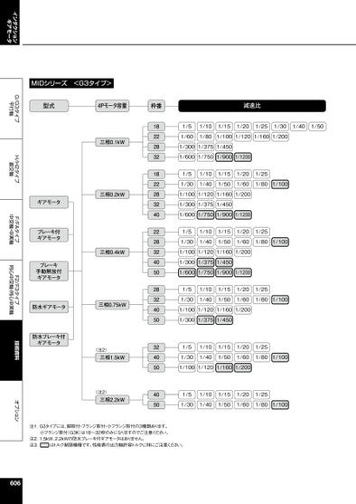 インダクションギアモータG/G3タイプ平行軸H/H2タイプ直交軸F/FAタイプ中空軸・中実軸F2/F3タイプ同心中空軸・同心中実軸技術資料オプションMIDシリーズ<G3タイプ>型式4Pモータ容量枠番減速比三相0.1kW三相0.2kW三相0.4kWギアモータブレーキ付ギアモータブレーキ手動解放付ギアモータ防水ギアモータ三相0.75kW防水ブレーキ付ギアモータ(注2)三相1.5kW(注2)三相2.2kW18222832182228324022283240502832405032405040501/51/101/151/201/251/301/401/501/601/801/1001/1201/1601/2001/3001/3751/4501/6001/7501/9001/12001/51/301/101/401/151/501/201/601/251/801/1001/1001/1201/1601/2001/3001/3751/4501/6001/7501/9001/12001/51/301/101/401/151/501/201/601/251/801/1001/1001/1201/1601/2001/3001/3751/4501/6001/7501/9001/12001/51/301/101/401/151/501/201/601/251/801/1001/1001/1201/1601/2001/3001/3751/4501/51/301/101/401/151/501/201/601/251/801/1001/1001/1201/1601/2001/51/301/101/401/151/501/201/601/251/801/100注1.G3タイプには、脚取付・フランジ取付・小フランジ取付の3種類あります。小フランジ取付(G3K)は18~32枠のみになりますのでご注意ください。注2.1.5kW、2.2kWの防水ブレーキ付ギアモータはありません。注3.はトルク制限機種です。性能表の出力軸許容トルクに特にご注意ください。606